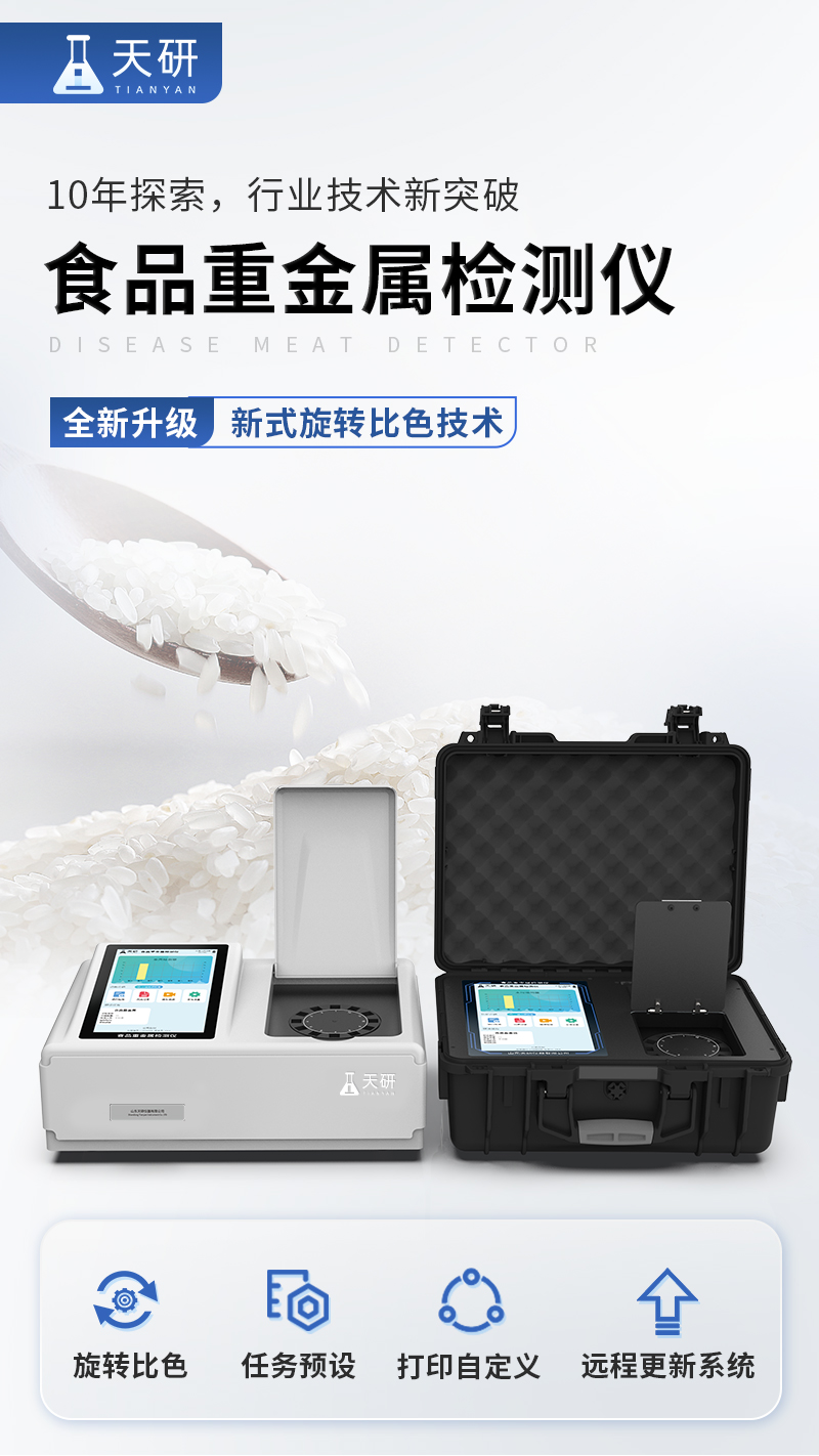 山東天研儀器有限公司生產(chǎn)的食品重金屬檢測儀為集成化食品安全快速檢測分析設備,采用手提箱一體化設計,重金屬檢測儀可廣泛應用于大米、糧谷、果品、蔬菜、藥材、水產(chǎn)品中重金屬鉛、鎘、六價鉻、汞、砷、鐵、鎳、鋁的快速檢測,檢測項目可根據(jù)日后需求可進行遠程升級。