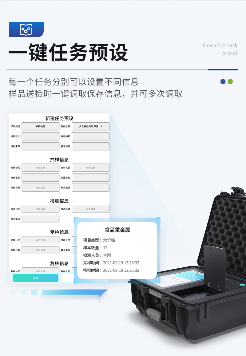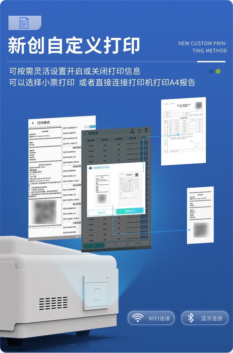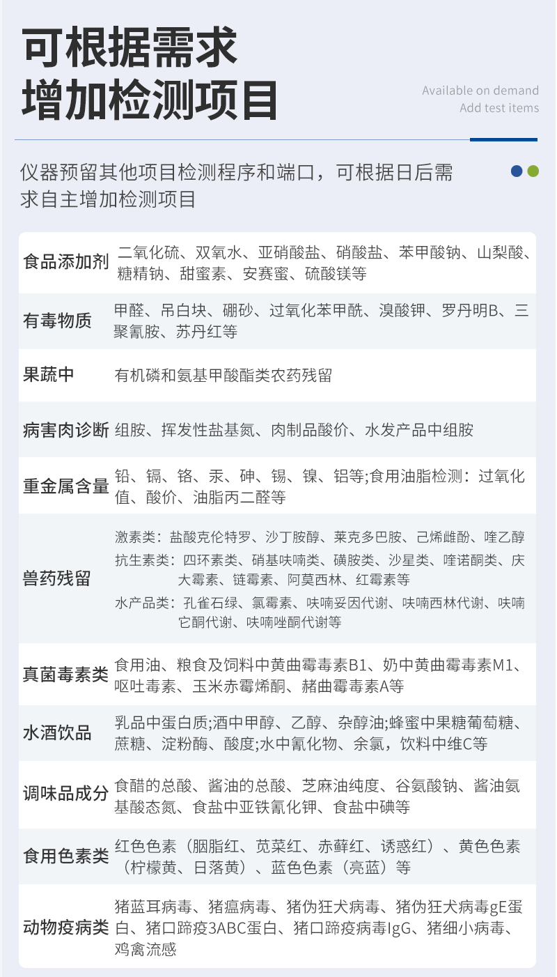 | 儀器采用手提一體化系統(tǒng)檢測技術,將分光光度模塊、數(shù)字化管理模塊、無線通訊模塊高度集成于一體,可支持檢測60種食品安全檢測項目,同時預留升級檢測方法。 | 儀器檢測模塊標準化、智能化,檢測項目可隨意自由組合。檢測箱體內置多個標準檢測單元,檢測模塊可以調整配置。 | 儀器采用全新安卓智能系統(tǒng),主控芯片采用 ARM Cortex-A7,RK3288/4核處理器,10.1寸高清液晶觸摸豎屏,更加**的UI交互界面,運轉快捷;儀器配備無線通信模塊: 4G(APN)通訊模塊、Wifi模塊,藍牙傳輸,同時具有雙USB接口以及RJ45接口能以多種方式實現(xiàn)數(shù)據(jù)保存和數(shù)據(jù)傳輸功能。 | 顯示屏幕:儀器采用10.1英寸豎向液晶觸摸屏顯,搭配運行安卓智能操作系統(tǒng),主控芯片采用ARM Cortex-A7,RK3288/4核處理器,主頻1.88Ghz,操作方便,性能更強。 | 檢測通道:≥12通道;采用精密旋轉比色池設計,使用同芯片同光源校準精度,解決不同光源之間的誤差值,更加準確**。(1-12通道間誤差0.1%,**號:ZL202022821055.2) | 儀器光源:高精度進口四波長冷光源,每個通道均配置 410、520、590、630nm 波長光源,標配**的光路切換裝置,**光路切換功能可實現(xiàn)64波長,并且所有檢測項目可實現(xiàn)所有通道同時檢測。 | 設備可一鍵校準,自動保存校準數(shù)據(jù),自動對比校驗,得到精準光源,采用Android SP存儲數(shù)據(jù),光源數(shù)據(jù)永不丟失,方便每一次使用。 | 通訊接口:配備無線通信模塊、4G(APN)通訊模塊、藍牙傳輸,同時具有雙USB接口以及RJ45網(wǎng)線接口,可以多方式實現(xiàn)數(shù)據(jù)保存及數(shù)據(jù)傳輸。 | 存儲方式:支持U盤存儲,標準USB接口,免驅動安裝。檢測結果存儲容量20萬條以上,可生成Excel表格進行拷貝,并具有登錄保護功能。 | 智能化操作系統(tǒng): | 1、操作系統(tǒng):儀器可在同一檢測界面自動對應相關檢測通道,一次性選擇1-12個樣品名稱,無需退出界面,節(jié)省操作時間。并可以對每個通道屬性和樣品信息單獨進行編輯,例如送檢單位、人員,檢測人員等,打印時勾選打印顯示。 | 2、數(shù)據(jù)集成系統(tǒng):設備首頁自動匯總分析檢測數(shù)據(jù),包含:周檢測數(shù)據(jù)、月檢測數(shù)據(jù),全部檢測總數(shù)量,均包含檢測總數(shù),合格數(shù),不合格數(shù),以及相關柱形分析圖,各項檢測數(shù)據(jù)一目了然,無需電腦查詢,更加快捷直觀。 | 3、數(shù)據(jù)庫系統(tǒng):十幾項數(shù)據(jù)庫分類管理儀器:包含項目類型、項目數(shù)據(jù)、檢測數(shù)據(jù)、歷史記錄、國標信息、曲線信息、采樣信息、檢測信息、受檢信息、復核信息、圖表信息、光源校準信息、打印樣式信息、樣品庫信息等等,數(shù)據(jù)庫之間互相協(xié)調聯(lián)動保證數(shù)據(jù)的真實完整性。同時產(chǎn)品數(shù)據(jù)庫以及歷史檢測記錄支持一鍵檢索功能。 | 4、限量規(guī)判系統(tǒng):具有限量查詢、添加物質合規(guī)判定系統(tǒng)。檢測出結果后,系統(tǒng)自動調用系統(tǒng)數(shù)據(jù)庫中相關國標進行比對判定,客觀顯示判定結果是否合格。 | 5、項目預設系統(tǒng):儀器具有任務預設模塊,一鍵提前預設,給出方便快捷的新檢測方案,每一個任務分別可以設置不同的樣品、批次、編號、來源、備注、抽樣信息、檢測信息、受檢信息、復核信息等更多信息。樣品送檢時一鍵調取保存信息,并可多次調取,大大提高檢測效率。 | 6、數(shù)據(jù)監(jiān)管系統(tǒng):同步對接監(jiān)管平臺,數(shù)據(jù)可局域網(wǎng)和互聯(lián)網(wǎng)數(shù)據(jù)上傳,檢測結果可選擇直接傳至食品安全監(jiān)管平臺。進行區(qū)域食品安全監(jiān)管及大數(shù)據(jù)分析處理與數(shù)據(jù)統(tǒng)計,檢測區(qū)域食品安全長短期動態(tài),達到食品安全問題預估、預警。 | 7、全新打印系統(tǒng):內置全新打印機,新創(chuàng)自定義打印方式,可按需靈活勾選控制:二維碼,抽樣信息、檢測信息,受檢信息、復核信息、抽樣日期、檢測日期等信息的打印。 | 8、A4紙版本報告打印功能(可選配):設備擁有兩種結果展示方式,可以自動生成A4打印模板和小票打印模板兩種樣式,可通過WiFi及網(wǎng)線等方式鏈接外置打印機可進行打印。 | 供電模式:儀器交直流兩用,直流12V供電,可連接車載電源,可配6ah大容量充電鋰電池,電量可實時顯示,方便戶外流動測試。 | 儀器具備遠程升級功能,可定向分客戶分儀器更新,開機后自動更新,并可持續(xù)性免費更新系統(tǒng)版本,無需像傳統(tǒng)產(chǎn)品返廠更新,節(jié)省時間及人力成本并避免了物流運輸返廠升級導致設備損壞的潛在風險。 |