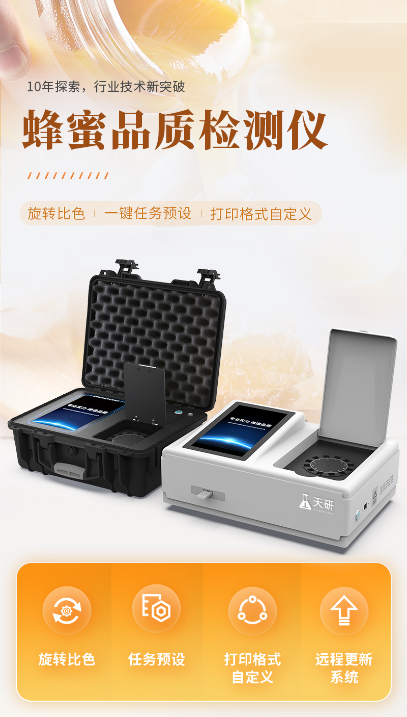 產(chǎn)品介紹: 該蜂蜜檢測(cè)儀為集成化食品安全快速檢測(cè)分析設(shè)備,廣泛應(yīng)用于食藥監(jiān)局、衛(wèi)生部門(mén)、高教院校、科研院所、農(nóng)業(yè)部門(mén)、養(yǎng)殖場(chǎng)、屠宰場(chǎng)、食品肉產(chǎn)品深加工企業(yè)、檢驗(yàn)檢疫部門(mén)等單位使用。 檢測(cè)項(xiàng)目: 檢測(cè)項(xiàng)目可從項(xiàng)目表中任選4項(xiàng),儀器預(yù)留其他項(xiàng)目程序和端口方便后期升級(jí),可根據(jù)