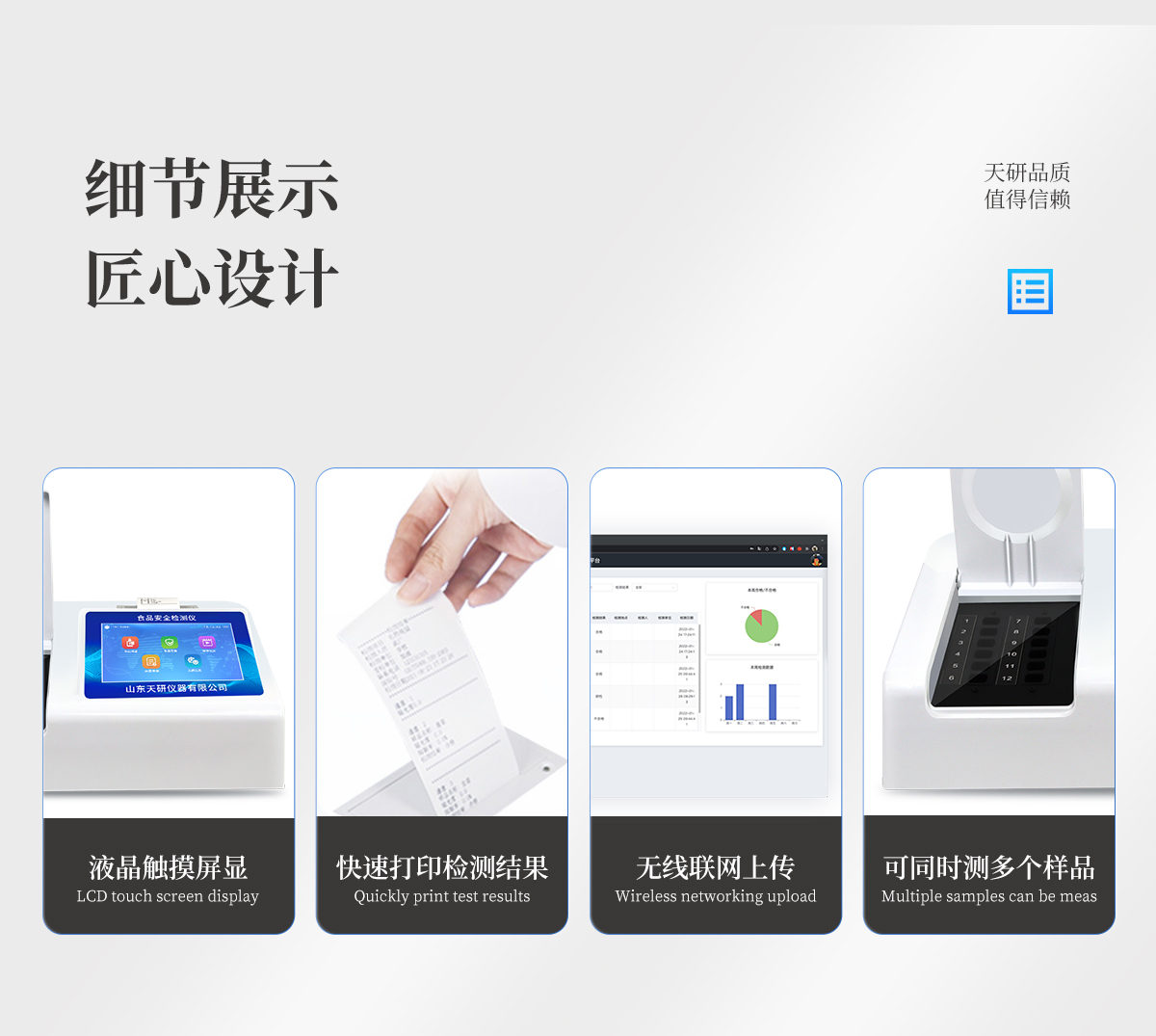 | 安卓智能操作系統(tǒng),采用更加**和人性化操作,儀器具有網(wǎng)線連接、wifi聯(lián)網(wǎng)上傳、GPRS無線遠(yuǎn)傳功能,快速上傳數(shù)據(jù)。 | 智能化程度高,儀器具有自檢功能:具有開機(jī)自檢和調(diào)零功能,具有自動檢測重復(fù)性功能。 | 檢測通道:≥12個檢測通道,可以同時測試多個樣品,每個樣品由程序控制分別獨(dú)立工作,不會互相干擾。 | 顯示方式:≥8英寸液晶觸摸屏顯示,人性化中文操作界面,讀數(shù)直觀、簡單。 | 配備新一代嵌入式熱敏打印機(jī),可選擇手動打印或者自動打印,檢測完成可自動打印檢測報(bào)告和二維碼。 | 光源采用進(jìn)口超高亮發(fā)光二極管,高精度、穩(wěn)定性強(qiáng)、光源可控、可以關(guān)掉不使用的光源,功耗更低。 | 采用USB2.0接口設(shè)計(jì),方便數(shù)據(jù)的存貯和移動,并可隨時與計(jì)算機(jī)直接相連,并且可用計(jì)算機(jī)控制儀器。實(shí)現(xiàn)數(shù)據(jù)查詢、瀏覽、分析、統(tǒng)計(jì)、打印等。 | 儀器帶有監(jiān)管平臺。數(shù)據(jù)可局域網(wǎng)和互聯(lián)網(wǎng)數(shù)據(jù)上傳,檢測結(jié)果直接傳至食品安全監(jiān)管平臺。進(jìn)行區(qū)域食品安全監(jiān)管及大數(shù)據(jù)分析處理,檢測區(qū)域食品安全長短期動態(tài),達(dá)到食品安全問題預(yù)估、預(yù)警 | 一體化便攜式快檢設(shè)備,滿足現(xiàn)場及流動檢測使用需求,能夠在同一軟件下實(shí)現(xiàn)所有檢測項(xiàng)目的檢測,并可通過同一窗口直觀顯示檢測結(jié)果。 | 儀器具有多品類多種類樣品菜單庫,可靈活選擇檢測樣品,不同的檢測通道可同時檢測不同的樣品項(xiàng)目。也可在儀器上直接編輯錄入樣品名稱、檢測指標(biāo)、送檢單位等信息并保存進(jìn)樣品數(shù)據(jù)庫。 | 樣品處理簡單省力,整體操作快速、安全、便捷。 | 儀器具有自身保護(hù)功能,可設(shè)置用戶名及密碼,防止非工作人員操作等。 | 高靈敏度,高檢測精度,高重復(fù)性精度,掃描式高精度光學(xué)傳感器。 | 儀器具有重新校準(zhǔn)、鎖定、恢復(fù)出廠設(shè)置功能。 | 支持U盤存儲。 結(jié)果判定線可修改,對照值標(biāo)定值可保存,斷電不丟失數(shù)據(jù)。 |