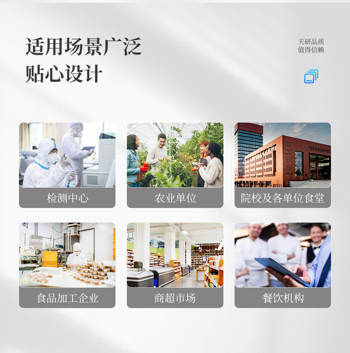 多功能食品安全檢測儀可快速檢測200多項(xiàng)目,包含非食用化學(xué)物質(zhì)、濫用食品添加劑、農(nóng)藥殘留、獸藥殘留、重金屬、病害肉、營養(yǎng)強(qiáng)化劑、抗生素類殘留、激素類殘留、真菌毒素類殘留、化學(xué)類殘留等現(xiàn)場的定性定量檢測。該多功能食品安全檢測儀為集成化食品安全快速檢測分析設(shè)備,廣泛應(yīng)用于市場監(jiān)管局、檢測中心、衛(wèi)生監(jiān)督部門、農(nóng)業(yè)部門、院校及各單位食堂、食品肉產(chǎn)品深加工企業(yè)、商超市場、司法部門、餐飲機(jī)構(gòu)、養(yǎng)殖場、屠宰場、檢驗(yàn)檢疫部門等單位使用。