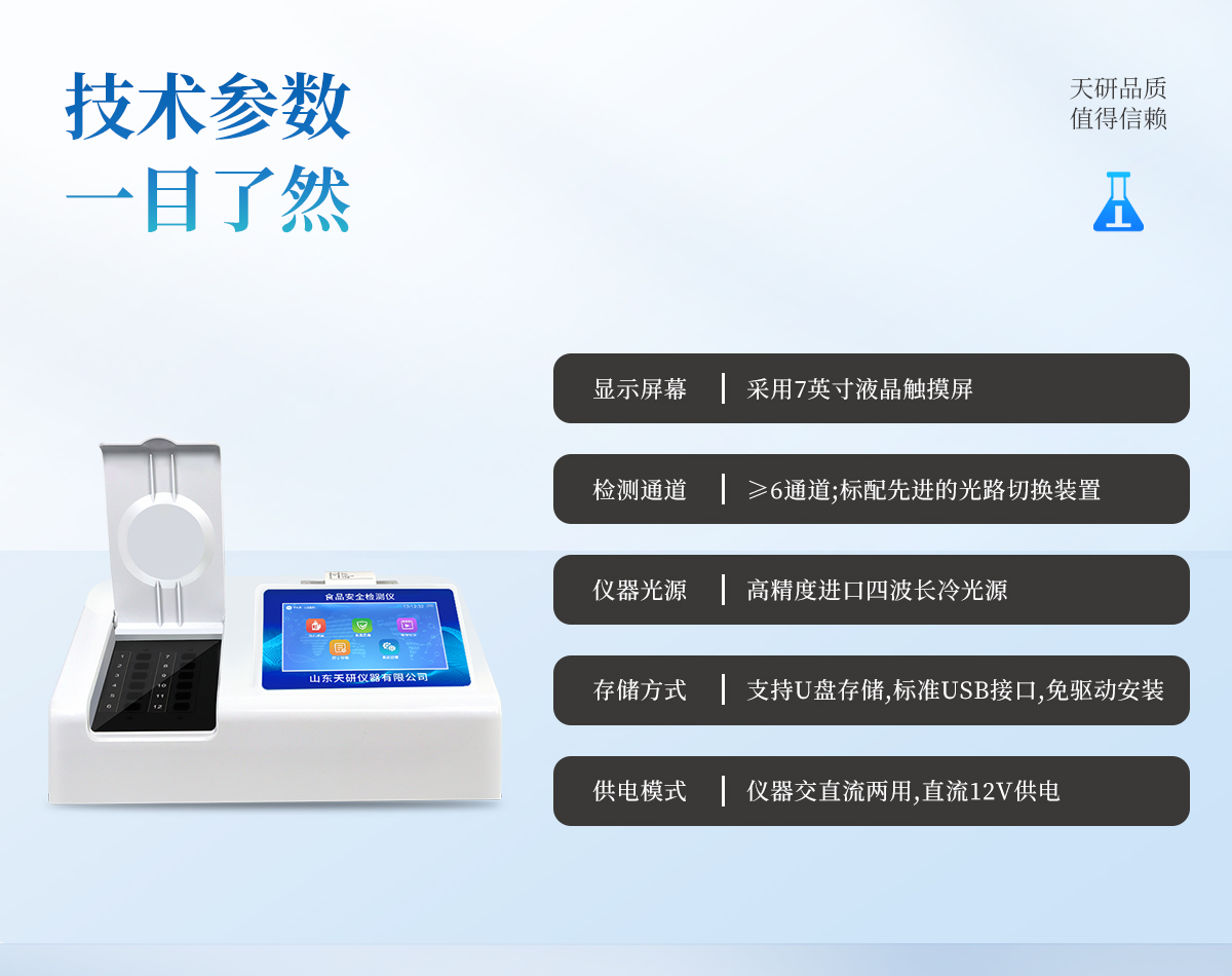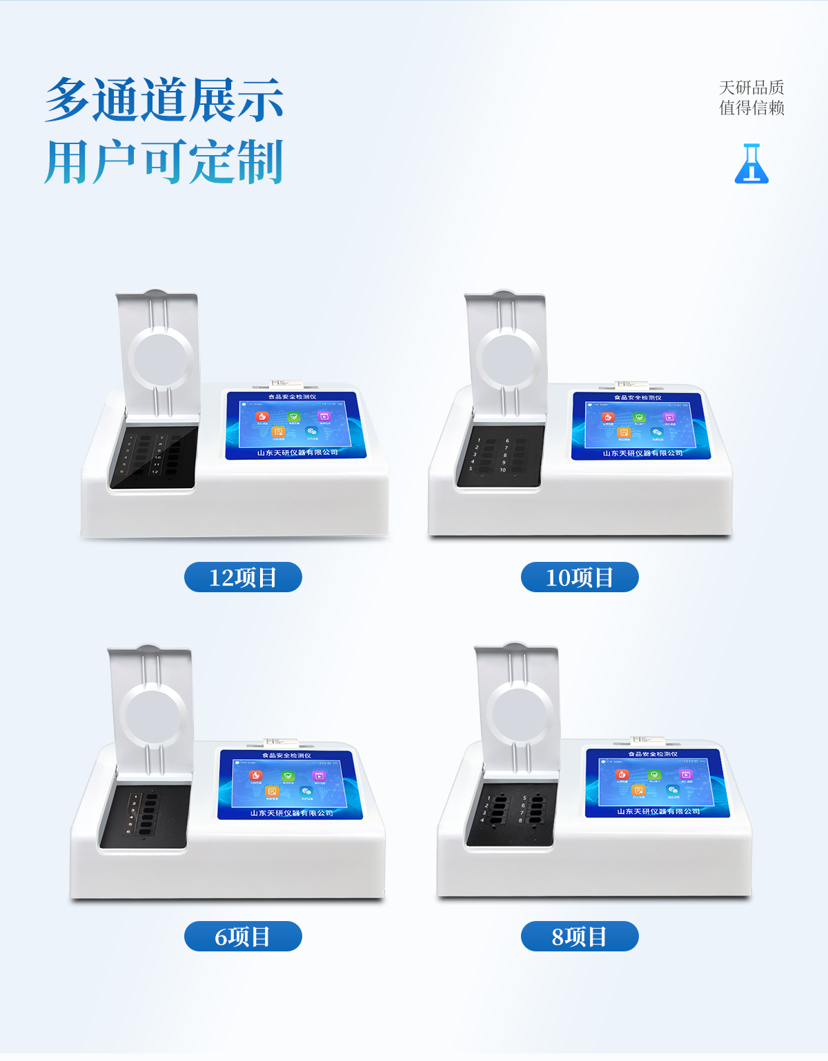 多功能食品安全檢測儀可快速檢測200多項目,包含非食用化學物質、濫用食品添加劑、農(nóng)藥殘留、獸藥殘留、重金屬、病害肉、營養(yǎng)強化劑、抗生素類殘留、激素類殘留、真菌毒素類殘留、化學類殘留等現(xiàn)場的定性定量檢測。該多功能食品安全檢測儀為集成化食品安全快速檢測分析設備,廣泛應用于市場監(jiān)管局、檢測中心、衛(wèi)生監(jiān)督部門、農(nóng)業(yè)部門、院校及各單位食堂、食品肉產(chǎn)品深加工企業(yè)、商超市場、司法部門、餐飲機構、養(yǎng)殖場、屠宰場、檢驗檢疫部門等單位使用。