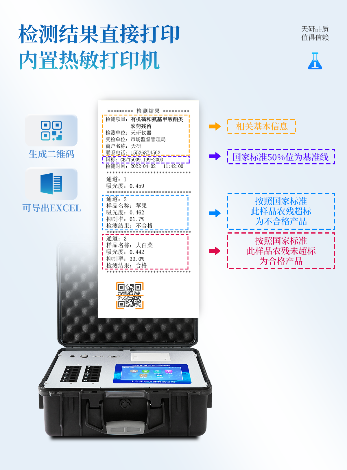 | 安卓智能操作系統(tǒng),采用更加**的UI交互界面,儀器具有wifi聯(lián)網(wǎng)上傳、4G聯(lián)網(wǎng)傳輸、GPRS無線遠(yuǎn)傳、網(wǎng)線連接功能,快速批量上傳數(shù)據(jù)。 | 智能化程度高,儀器具有自檢功能:具有開機自檢和調(diào)零功能,具有自動檢測重復(fù)性功能。 | 新一代高速熱敏打印機,檢測完成可自動打印或批量打印檢測報告和二維碼。 | 儀器帶有監(jiān)管平臺,數(shù)據(jù)可局域網(wǎng)和互聯(lián)網(wǎng)數(shù)據(jù)上傳,檢測結(jié)果直接傳至食品安全監(jiān)管平臺。進(jìn)行區(qū)域食品安全監(jiān)管及大數(shù)據(jù)分析處理與數(shù)據(jù)統(tǒng)計,檢測區(qū)域食品安全長短期動態(tài),達(dá)到食品安全問題預(yù)估、預(yù)警 | 一體化主機,包含食品安全檢測模塊、多通道農(nóng)藥殘留檢測模塊、膠體金免疫層析檢測模塊。 | 一體化便攜式快檢設(shè)備,滿足現(xiàn)場及流動檢測使用需求,能夠在同一軟件下實現(xiàn)所有檢測項目的檢測,并可通過同一窗口直觀顯示檢測結(jié)果。 | 膠體金模塊檢測方式:軌道式自動傳輸掃描,檢測完成后自動退出檢測卡。 | CT線自動識別,無需手動調(diào)整。 | 內(nèi)置強大的數(shù)據(jù)庫,具有多品類多種類樣品菜單功能,可靈活選擇檢測樣品,不同的檢測通道可同時檢測不同的樣品項目。也可在儀器上直接編輯錄入樣品名稱、檢測指標(biāo)、送檢單位等信息并保存進(jìn)樣品數(shù)據(jù)庫。 | 產(chǎn)品內(nèi)置操作演示視頻,是您身邊的化驗指導(dǎo)專家。 | 樣品處理簡單省力,整體操作快速、安全、便捷。 | 儀器具有自身保護功能,可設(shè)置用戶名及密碼,防止非工作人員操作等。 | 高靈敏度,高檢測精度,高重復(fù)性精度,掃描式高精度光學(xué)傳感器。 | 結(jié)果判定線可修改,對照值標(biāo)定值可保存,斷電不丟失數(shù)據(jù)。 | 兼容市場上所有的膠體金卡,使用耗材不受限制,極大增強用戶使用體驗。 | 儀器具有重新校準(zhǔn)、鎖定、恢復(fù)出廠設(shè)置功能。 |