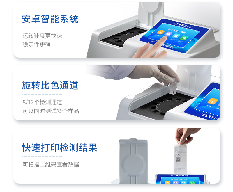 | 安卓智能操作系統(tǒng),采用更加**和人性化操作,儀器具有無線聯(lián)網(wǎng)上傳功能,快速上傳數(shù)據(jù),進(jìn)行數(shù)據(jù)統(tǒng)計和分析。 | 智能化程度高,儀器具有自檢功能:具有開機(jī)自檢和調(diào)零功能,具有自動檢測重復(fù)性功能;同時,檢測完成可自動打印檢測報告和二維碼。手機(jī)掃碼可顯示出詳細(xì)檢測信息。 | 儀器帶有監(jiān)管平臺,數(shù)據(jù)可局域網(wǎng)和互聯(lián)網(wǎng)數(shù)據(jù)上傳,檢測結(jié)果直接傳至食品安全監(jiān)管平臺。進(jìn)行區(qū)域食品安全監(jiān)管及大數(shù)據(jù)分析處理與數(shù)據(jù)統(tǒng)計,檢測區(qū)域食品安全長短期動態(tài),達(dá)到食品安全問題預(yù)估、預(yù)警 。 | 樣品處理簡單省力,整體操作快速、安全、便捷。 | 儀器具有自身保護(hù)功能,可設(shè)置用戶名及密碼,防止非工作人員操作等。 | 內(nèi)置強(qiáng)大的數(shù)據(jù)庫,可在儀器上直接選擇樣品名稱、檢測指標(biāo)、送檢單位等信息,也可在儀器上直接編輯錄入樣品名稱、檢測指標(biāo)、送檢單位等信息并保存進(jìn)樣品數(shù)據(jù)庫,方便后期操作調(diào)取使用。 | 儀器具有重新校準(zhǔn)、鎖定、恢復(fù)出廠設(shè)置功能。 |