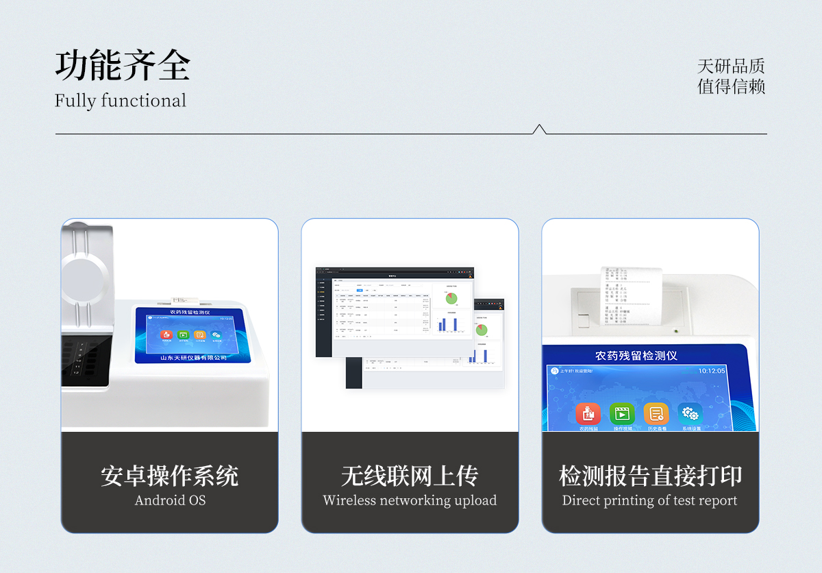 | 乙酰膽堿酯酶和丁酰膽堿酯酶試劑均可以使用,符合國家標(biāo)準(zhǔn)和農(nóng)業(yè)部標(biāo)準(zhǔn)的要求。 | 自動判斷樣品是否合格,檢測結(jié)果更加直觀。 | 儀器具有100多種蔬菜名稱菜單庫,分類管理,并可按需添加或刪除蔬菜名,編輯蔬菜名稱,可直接打印出蔬菜名稱。 | 檢測通道:10個檢測通道,可以同時測試多個樣品,循環(huán)檢測,即放即檢,每個樣品由程序控制分別獨(dú)立工作,不會互相干擾。 | 智能操作系統(tǒng),采用更加人性化操作,主控采用多核處理器,主頻1.88Ghz,運(yùn)轉(zhuǎn)速度更快速,穩(wěn)定性更強(qiáng)。 | 顯示方式:7英寸高靈敏真彩觸摸屏顯示,人性化中文操作界面,讀數(shù)直觀、簡單。 | 打印機(jī)采用串口5v打印,可選擇手動打印或者自動打印,三分鐘出打印結(jié)果,打印格式為檢測人姓名、吸光度差值、檢測時間、檢測機(jī)構(gòu)、樣品名稱及結(jié)果判定。 | 光源采用進(jìn)口超高亮發(fā)光二極管,具有低功耗、高精度、穩(wěn)定性強(qiáng)、光源可控可以關(guān)掉不使用的光源,響應(yīng)速度快等優(yōu)點(diǎn)。 | 智能恒流穩(wěn)壓,光強(qiáng)自動校準(zhǔn),長時間連續(xù)工作光源無溫漂現(xiàn)象。 | 儀器具有GPRS遠(yuǎn)傳功能,可插手機(jī)卡實(shí)現(xiàn)數(shù)據(jù)遠(yuǎn)傳平臺,wifi聯(lián)網(wǎng)功能,可將數(shù)據(jù)快速上傳電腦,進(jìn)行數(shù)據(jù)管理與統(tǒng)計(jì)。 | 采用USB2.0接口設(shè)計(jì),方便數(shù)據(jù)的存貯和移動,并可隨時與計(jì)算機(jī)直接相連,并且可用計(jì)算機(jī)控制儀器。實(shí)現(xiàn)數(shù)據(jù)查詢、瀏覽、分析、統(tǒng)計(jì)、打印等。 | 智能化程度高,儀器具有自檢功能:具有開機(jī)自檢和調(diào)零功能,具有自動檢測重復(fù)性功能 | 儀器具有自身保護(hù)功能,可設(shè)置用戶名及密碼,防止非工作人員操作等。 | 采用DC12v直流供電,安全系統(tǒng)更高,并且配備6A鋰電池充電器。 | 儀器具有重新校準(zhǔn)、鎖定、恢復(fù)出廠設(shè)置功能。 |