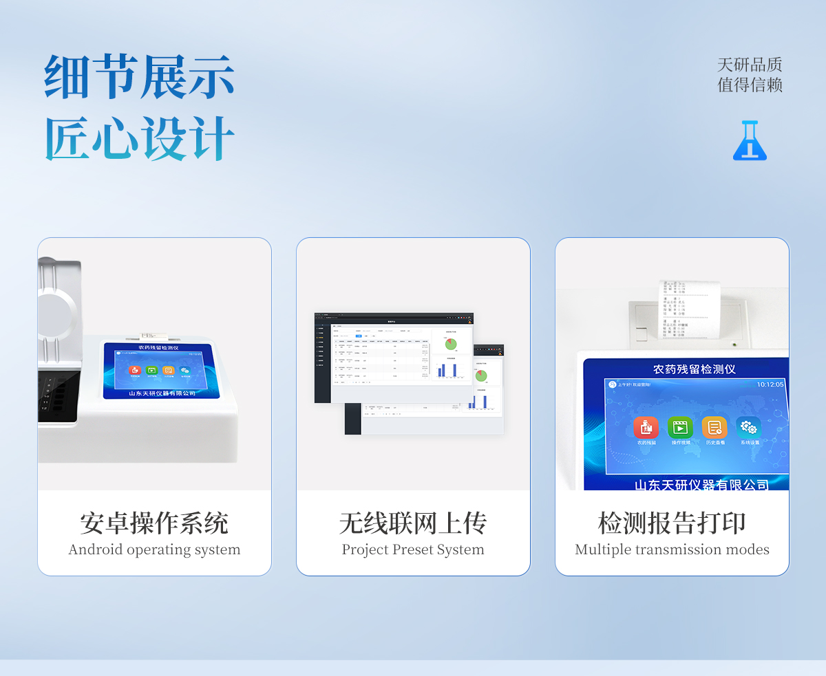 | 乙酰膽堿酯酶和丁酰膽堿酯酶試劑均可以使用,符合國家標(biāo)準(zhǔn)和農(nóng)業(yè)部標(biāo)準(zhǔn)的要求。 | 自動判斷樣品是否合格,檢測結(jié)果更加直觀。 | 儀器具有100多種蔬菜名稱菜單庫,分類管理,并可按需添加或刪除蔬菜名,編輯蔬菜名稱,可直接打印出蔬菜名稱。 | 檢測通道:24個檢測通道,可以同時測試多個樣品,循環(huán)檢測,即放即檢,每個樣品由程序控制分別獨立工作,不會互相干擾。 | 智能操作系統(tǒng),采用更加人性化操作,主控采用多核處理器,主頻1.88Ghz,運轉(zhuǎn)速度更快速,穩(wěn)定性更強。 | 顯示方式:7英寸高靈敏真彩觸摸屏顯示,人性化中文操作界面,讀數(shù)直觀、簡單。 | 打印機采用串口5v打印,可選擇手動打印或者自動打印,三分鐘出打印結(jié)果,打印格式為檢測人姓名、吸光度差值、檢測時間、檢測機構(gòu)、樣品名稱及結(jié)果判定。 | 光源采用進口超高亮發(fā)光二極管,具有低功耗、高精度、穩(wěn)定性強、光源可控可以關(guān)掉不使用的光源,響應(yīng)速度快等優(yōu)點。 | 智能恒流穩(wěn)壓,光強自動校準(zhǔn),長時間連續(xù)工作光源無溫漂現(xiàn)象。 | 儀器具有GPRS遠傳功能,可插手機卡實現(xiàn)數(shù)據(jù)遠傳平臺,wifi聯(lián)網(wǎng)功能,可將數(shù)據(jù)快速上傳電腦,進行數(shù)據(jù)管理與統(tǒng)計。 | 采用USB2.0接口設(shè)計,方便數(shù)據(jù)的存貯和移動,并可隨時與計算機直接相連,并且可用計算機控制儀器。實現(xiàn)數(shù)據(jù)查詢、瀏覽、分析、統(tǒng)計、打印等。 | 智能化程度高,儀器具有自檢功能:具有開機自檢和調(diào)零功能,具有自動檢測重復(fù)性功能 | 儀器具有自身保護功能,可設(shè)置用戶名及密碼,防止非工作人員操作等。 | 采用DC12v直流供電,安全系統(tǒng)更高,并且配備6A鋰電池充電器。 | 儀器具有重新校準(zhǔn)、鎖定、恢復(fù)出廠設(shè)置功能。 |