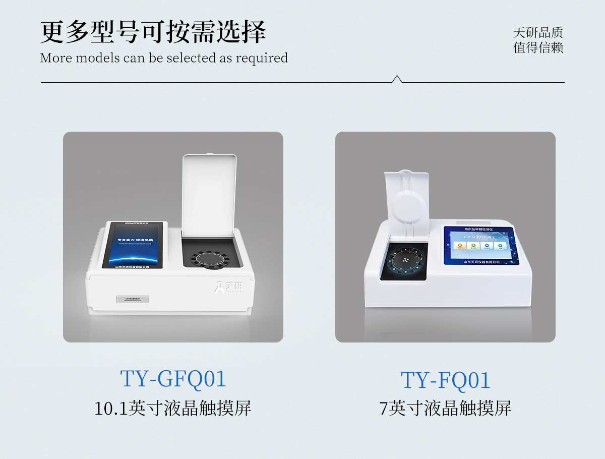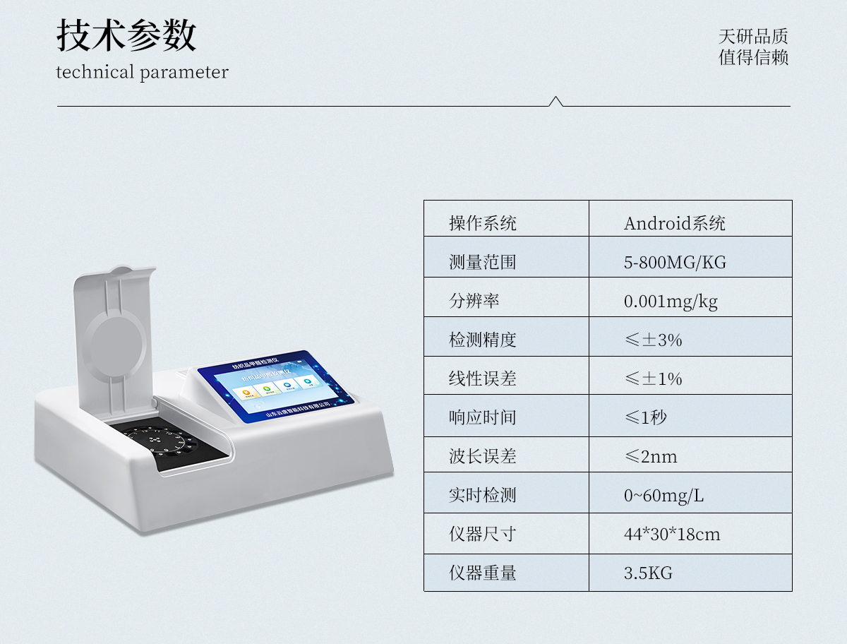 | 1、智能**且方便 | ①智能芯片:主控芯片采用ARM Cortex-A7,RK3288/4核處理器,搭配安卓智能操作系統(tǒng),集實驗操作,分析結(jié)果,打印報告等功能于一體,使用方便,性能更強。 | ②大屏顯示:采用10.1英寸液晶觸摸屏,單機即可操作,無需連接外部顯示或控制器。 | ③多樣同檢:儀器具有12個檢測通道,可同時一次性檢測11個樣品,效率更高。 | ④工作預設:具有任務預設模塊,一鍵提前預設樣品所有信息內(nèi)容。來樣時可直接檢測,同時可多次調(diào)取。 | ⑤數(shù)據(jù)分析:設備首頁自動匯總分析數(shù)據(jù),并繪制柱形分析圖,各項檢測數(shù)據(jù)一目了然,快捷直觀。 | ⑥高度集成:模塊高度集合,將分光光度模塊、數(shù)字化管理模塊、無線通訊模塊集成于一體。可將檢測結(jié)果進行分析,直接上傳至數(shù)據(jù)平臺,實現(xiàn)數(shù)據(jù)共享,方便后期進行數(shù)據(jù)分析與統(tǒng)計。 | ⑦遠程升級:儀器具備遠程升級功能,可遠程升級程序,無需返廠,并可持續(xù)性免費更新系統(tǒng)版本,降低成本及運輸損耗風險。 | 2、檢測精準且直觀 | ①**技術:精密旋轉(zhuǎn)比色池,使用同芯片同光源校準精度,解決不同光源之間存在波長誤差的問題,更加準確**。 | ②結(jié)果直觀:儀器自動對檢測結(jié)果與國標限量值進行對比,自動判定結(jié)果是否合格,結(jié)果更直觀。 | 3、功能強大且實用 | ①存儲功能:設備可以存儲數(shù)據(jù)100000組,可在屏幕上直觀查看歷史數(shù)據(jù),可導出數(shù)據(jù)。 | ②打印功能:設備自帶打印功能,可對樣品信息及檢測結(jié)果無限次隨意打印。 | ③全新方式:新創(chuàng)自定義打印方式,可按需靈活勾選控制:二維碼,抽樣信息、檢測信息,受檢信息、復核信息、抽樣日期、檢測日期等信息的打印 | ④多重編輯:樣品信息可多重編輯,可以對每個通道屬性和樣品信息單獨進行編輯,例如樣品信息、抽樣信息、檢測信息,受檢信息、復核信息、抽樣日期、檢測日期等信息等。 | ⑤雙語設計:全中文/英文操作菜單,簡單實用,適用于不同用戶的需求。 |