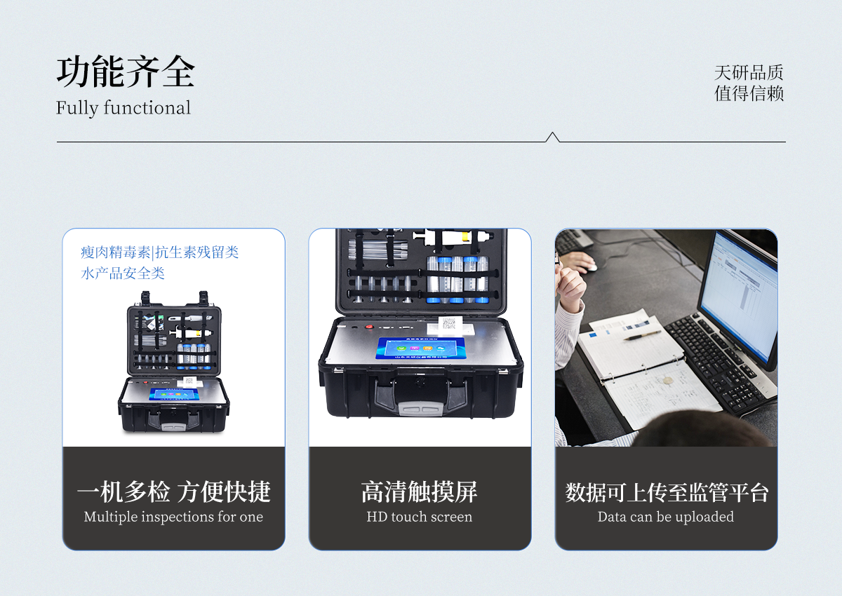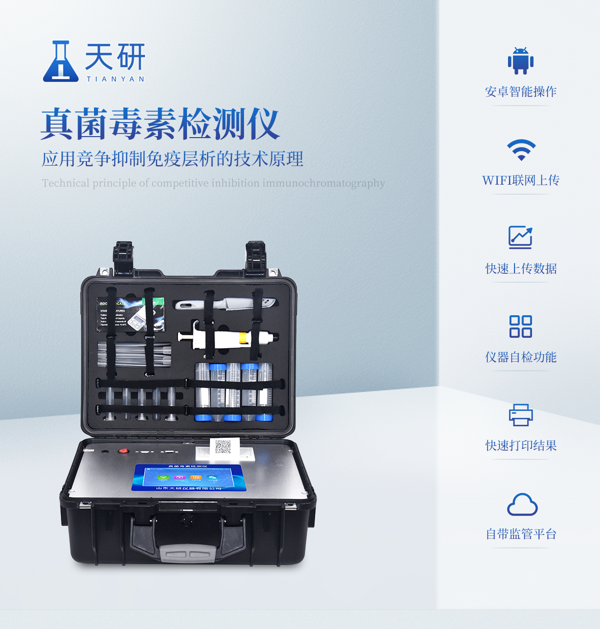 | 用途:可用于糧食谷物及其制品、飼料、植物油中真菌毒素快速定量測定; | 檢測方法:采用發(fā)光定量免疫層析技術,激光激發(fā),掃描方式收集發(fā)光熒光信號。 | 定量參數(shù)設定:RFID芯片記錄檢測目標的標準曲線,根據(jù)不同樣本類型配備多參數(shù)卡; | 識別功能:試劑插卡后儀器自動識別檢測項目; | 靈敏性和特異性:不受外界的背景干擾, 檢測限為0.4-4500ug/kg;對其它毒素無非特異反應; | 穩(wěn)定性:無淬滅和光漂白現(xiàn)象; | 檢測時間快,實時顯示檢測曲線 | 無需孵育器,室溫(15-30℃)下進行測試 | 數(shù)據(jù)獲取和處理:檢測結果自動獲?。o需目測),可實時打印檢測報告;數(shù)據(jù)可儲存,可導出。 | 儀器可靠:有開機系統(tǒng)自檢功能;儀器配有質(zhì)控卡,確保檢測系統(tǒng)自身的準確性; | 檢測數(shù)據(jù)精準可靠:HPLC/LC-MS結果接近 | 檢測儀器獲得國家認證 | 聯(lián)網(wǎng):網(wǎng)絡接口 | 升級:可以通過U盤進行軟件升級 | 存儲空間:≥32G,**擴展至64G | 工作功率:40W | 操作系統(tǒng):windows 7 | 顯示屏:可觸摸顯示屏,屏幕尺寸≥8寸 | 定量檢測項目:包括黃曲霉毒素B1、嘔吐毒素、玉米赤霉烯酮、T-2毒素、伏馬毒素 |
