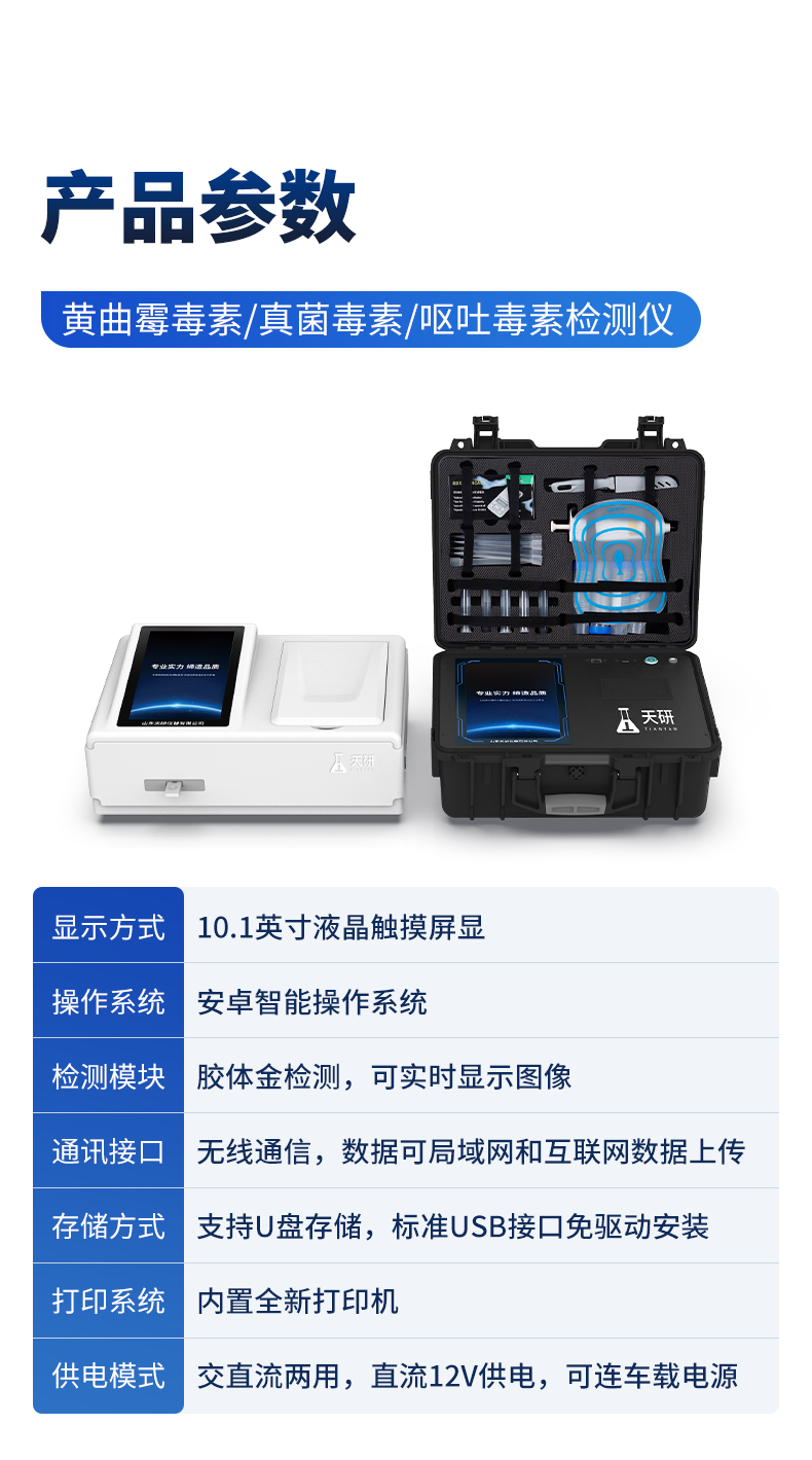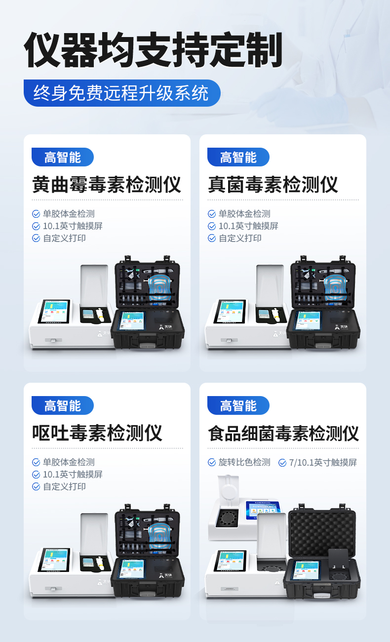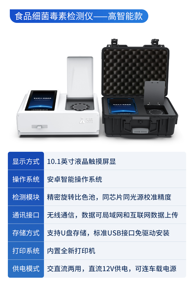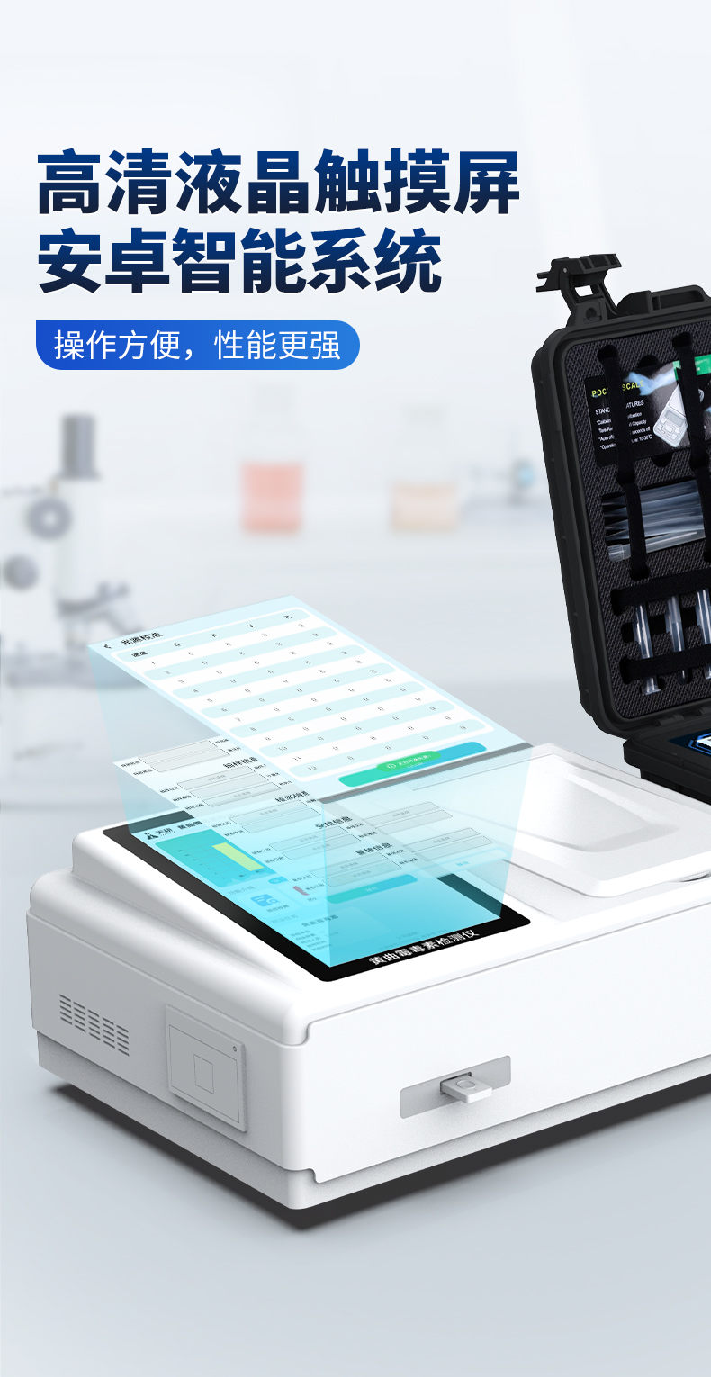 | 1、儀器采用10.1英寸液晶觸摸屏顯,搭配運(yùn)行安卓智能操作系統(tǒng),主控芯片采用ARM Cortex-A7,RK3288/4核處理器,主頻1.88Ghz,運(yùn)轉(zhuǎn)速度更快速,性能更強(qiáng)。 | 2、儀器功能包括:膠體金檢測模塊、數(shù)字化管理模塊、無線通訊模塊等,可以滿足同一軟件下實(shí)現(xiàn)所有檢測項(xiàng)目的檢測,并在同一窗口展示檢測結(jié)果。 | 3.一體化臺式快檢設(shè)備,采用交直流兩用供電方式,可連接車載電源,配備6ah大容量充電鋰電池,可以滿足現(xiàn)場及流動檢測使用的需求。儀器尺寸:43×35×20cm, 主機(jī)凈重:5.1kg | 4、系統(tǒng)自帶數(shù)據(jù)集成模塊,設(shè)備首頁自動統(tǒng)計(jì)檢測數(shù)據(jù)包含:周檢測數(shù)據(jù)、月檢測數(shù)據(jù),全部檢測總數(shù)量,均包含檢測總數(shù),合格數(shù),不合格數(shù),以及相關(guān)柱形分析圖,對各項(xiàng)檢測數(shù)據(jù)清晰掌握,無需電腦查詢,更加快捷直觀。 | 5、儀器具有任務(wù)預(yù)設(shè)模塊,可在樣品送檢前提前預(yù)設(shè)樣品名稱、檢測指標(biāo)、送檢單位等信息,樣品送檢時一鍵調(diào)取保存信息,檢測更加方便快捷。 | 6、膠體金檢測模塊: | 直插式自動掃描方式,可實(shí)時顯示金標(biāo)卡實(shí)時圖像,系統(tǒng)自動分析并呈現(xiàn)出CT曲線圖,CT線自動識別,無需手動調(diào)整,完成檢測后自動退出檢測卡。 | 結(jié)果判定線可修改,對照值標(biāo)定值可保存,斷電不丟失數(shù)據(jù)。 | 兼容市場上其他膠體金卡,使用耗材不受限制,極大增強(qiáng)用戶使用體驗(yàn)。 | 7、儀器檢測系統(tǒng)擁有龐大數(shù)據(jù)庫,并且構(gòu)建了完善的檢索、修訂功能。食品庫涵蓋多種樣品名稱,可按需添加或刪除、編輯樣品名稱;產(chǎn)品數(shù)據(jù)庫以及歷史檢測記錄支持一鍵檢索功能。 | 8、系統(tǒng)打印自定義化,打印格式多樣化,產(chǎn)品合格證(國家標(biāo)準(zhǔn)要求),二維碼,抽樣信息、檢測信息,受檢信息、復(fù)核信息、抽樣日期、檢測日期等信息結(jié)果,可按需求自行設(shè)置打印內(nèi)容。 | 9、A4紙版本報告打印功能(可選配):設(shè)備擁有兩種結(jié)果展示方式,可以自動生成A4打印模板和小票打印模板兩種樣式,可通過WiFi及網(wǎng)線等方式鏈接外置打印機(jī)可進(jìn)行打印 | 10、儀器具有 wifi 聯(lián)網(wǎng)上傳、RJ45網(wǎng)線連接功能,可以快速上傳數(shù)據(jù)。同步對接監(jiān)管平臺,數(shù)據(jù)可局域網(wǎng)和互聯(lián)網(wǎng)數(shù)據(jù)上傳,檢測結(jié)果直接傳至食品安全監(jiān)管平臺。進(jìn)行區(qū)域食品安全監(jiān)管及大數(shù)據(jù)分析處理與數(shù)據(jù)統(tǒng)計(jì),檢測區(qū)域食品安全長短期動態(tài),達(dá)到食品安全問題預(yù)估、預(yù)警。 | 11、設(shè)備支持U盤存儲,標(biāo)準(zhǔn)USB接口,免驅(qū)動安裝。檢測結(jié)果存儲容量20萬條以上,可生成Excel表格,進(jìn)行一鍵拷貝,并具有登錄保護(hù)功能,可設(shè)置用戶名及密碼,規(guī)范不同人員操作權(quán)限,防止非工作人員操作,并且可以進(jìn)行重新校準(zhǔn)、鎖定、恢復(fù)出廠設(shè)置功能。儀器固件可升級,后期檢測項(xiàng)目可擴(kuò)充。 | 12、儀器具備遠(yuǎn)程升級功能,可定向分客戶分儀器更新,開機(jī)后自動更新,并可持續(xù)性免費(fèi)更新系統(tǒng)版本,無需像傳統(tǒng)產(chǎn)品返廠更新,節(jié)省時間及人力成本并避免了物流運(yùn)輸返廠升級導(dǎo)致設(shè)備損壞的潛在風(fēng)險。 |