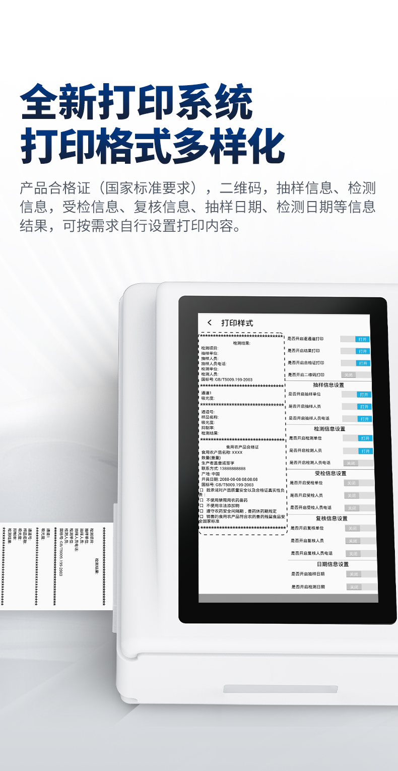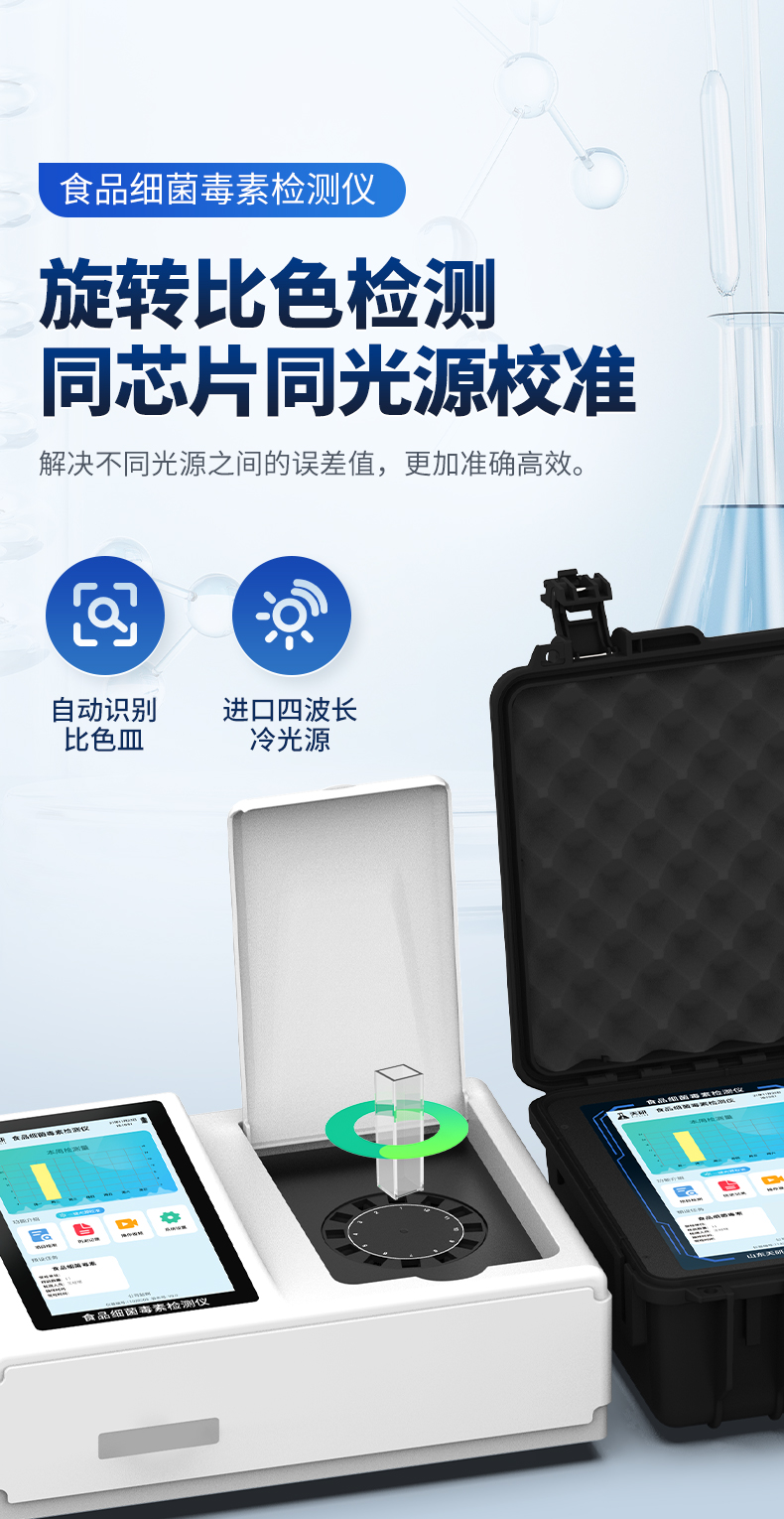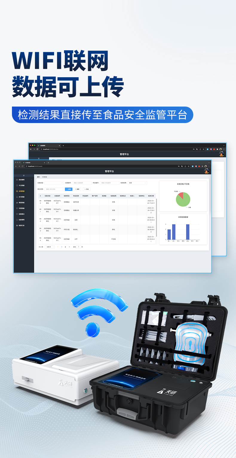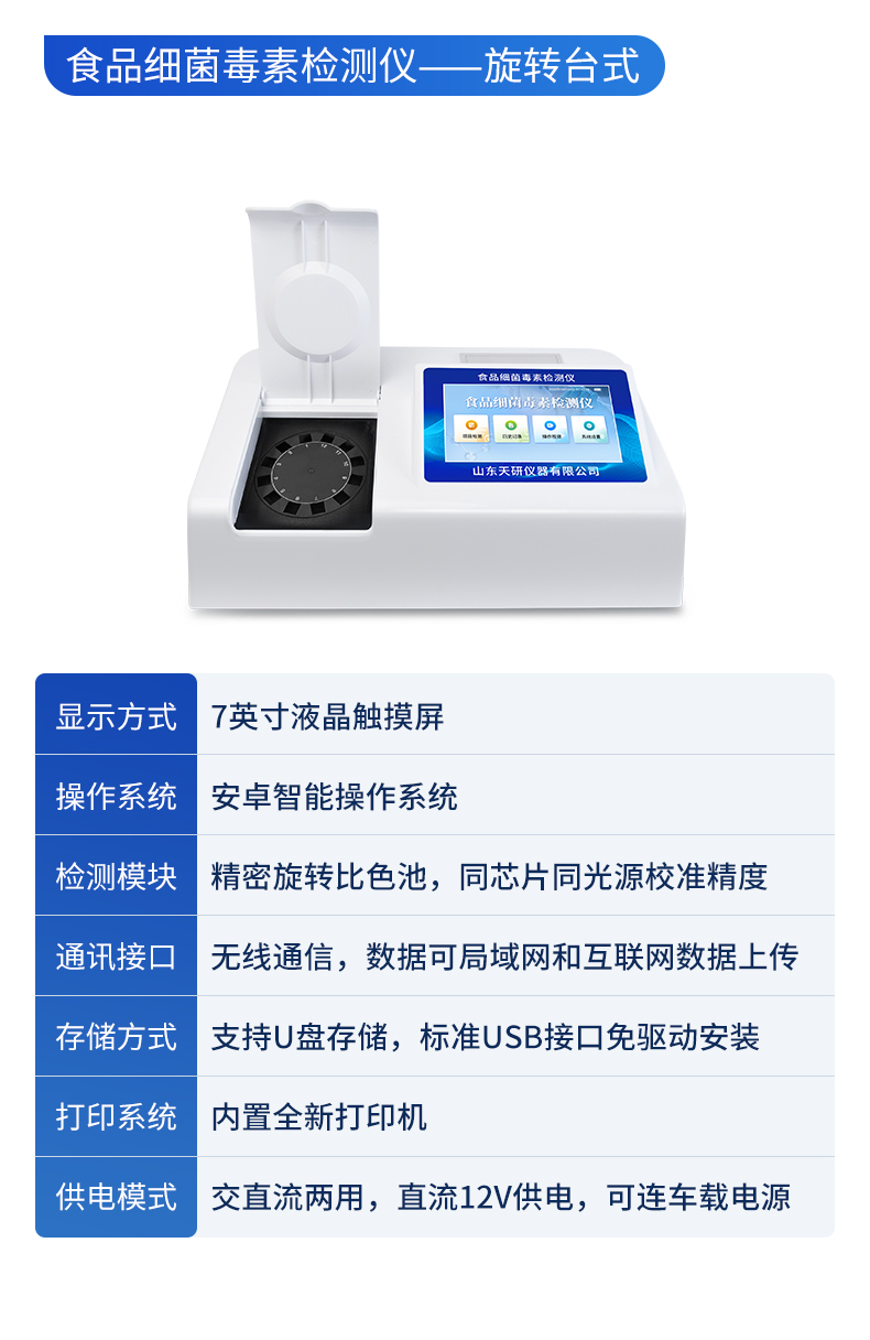 | 1、儀器采用10.1英寸液晶觸摸屏顯,搭配運(yùn)行安卓智能操作系統(tǒng),主控芯片采用ARM Cortex-A7,RK3288/4核處理器,主頻1.88Ghz,運(yùn)轉(zhuǎn)速度更快速,性能更強(qiáng)。 | 2、儀器功能包括:膠體金檢測模塊、數(shù)字化管理模塊、無線通訊模塊等,可以滿足同一軟件下實(shí)現(xiàn)所有檢測項(xiàng)目的檢測,并在同一窗口展示檢測結(jié)果。 | 3.一體化臺式快檢設(shè)備,采用交直流兩用供電方式,可連接車載電源,配備6ah大容量充電鋰電池,可以滿足現(xiàn)場及流動檢測使用的需求。儀器尺寸:43×35×20cm, 主機(jī)凈重:5.1kg | 4、系統(tǒng)自帶數(shù)據(jù)集成模塊,設(shè)備首頁自動統(tǒng)計(jì)檢測數(shù)據(jù)包含:周檢測數(shù)據(jù)、月檢測數(shù)據(jù),全部檢測總數(shù)量,均包含檢測總數(shù),合格數(shù),不合格數(shù),以及相關(guān)柱形分析圖,對各項(xiàng)檢測數(shù)據(jù)清晰掌握,無需電腦查詢,更加快捷直觀。 | 5、儀器具有任務(wù)預(yù)設(shè)模塊,可在樣品送檢前提前預(yù)設(shè)樣品名稱、檢測指標(biāo)、送檢單位等信息,樣品送檢時一鍵調(diào)取保存信息,檢測更加方便快捷。 | 6、膠體金檢測模塊: | 直插式自動掃描方式,可實(shí)時顯示金標(biāo)卡實(shí)時圖像,系統(tǒng)自動分析并呈現(xiàn)出CT曲線圖,CT線自動識別,無需手動調(diào)整,完成檢測后自動退出檢測卡。 | 結(jié)果判定線可修改,對照值標(biāo)定值可保存,斷電不丟失數(shù)據(jù)。 | 兼容市場上其他膠體金卡,使用耗材不受限制,極大增強(qiáng)用戶使用體驗(yàn)。 | 7、儀器檢測系統(tǒng)擁有龐大數(shù)據(jù)庫,并且構(gòu)建了完善的檢索、修訂功能。食品庫涵蓋多種樣品名稱,可按需添加或刪除、編輯樣品名稱;產(chǎn)品數(shù)據(jù)庫以及歷史檢測記錄支持一鍵檢索功能。 | 8、系統(tǒng)打印自定義化,打印格式多樣化,產(chǎn)品合格證(國家標(biāo)準(zhǔn)要求),二維碼,抽樣信息、檢測信息,受檢信息、復(fù)核信息、抽樣日期、檢測日期等信息結(jié)果,可按需求自行設(shè)置打印內(nèi)容。 | 9、A4紙版本報告打印功能(可選配):設(shè)備擁有兩種結(jié)果展示方式,可以自動生成A4打印模板和小票打印模板兩種樣式,可通過WiFi及網(wǎng)線等方式鏈接外置打印機(jī)可進(jìn)行打印 | 10、儀器具有 wifi 聯(lián)網(wǎng)上傳、RJ45網(wǎng)線連接功能,可以快速上傳數(shù)據(jù)。同步對接監(jiān)管平臺,數(shù)據(jù)可局域網(wǎng)和互聯(lián)網(wǎng)數(shù)據(jù)上傳,檢測結(jié)果直接傳至食品安全監(jiān)管平臺。進(jìn)行區(qū)域食品安全監(jiān)管及大數(shù)據(jù)分析處理與數(shù)據(jù)統(tǒng)計(jì),檢測區(qū)域食品安全長短期動態(tài),達(dá)到食品安全問題預(yù)估、預(yù)警。 | 11、設(shè)備支持U盤存儲,標(biāo)準(zhǔn)USB接口,免驅(qū)動安裝。檢測結(jié)果存儲容量20萬條以上,可生成Excel表格,進(jìn)行一鍵拷貝,并具有登錄保護(hù)功能,可設(shè)置用戶名及密碼,規(guī)范不同人員操作權(quán)限,防止非工作人員操作,并且可以進(jìn)行重新校準(zhǔn)、鎖定、恢復(fù)出廠設(shè)置功能。儀器固件可升級,后期檢測項(xiàng)目可擴(kuò)充。 | 12、儀器具備遠(yuǎn)程升級功能,可定向分客戶分儀器更新,開機(jī)后自動更新,并可持續(xù)性免費(fèi)更新系統(tǒng)版本,無需像傳統(tǒng)產(chǎn)品返廠更新,節(jié)省時間及人力成本并避免了物流運(yùn)輸返廠升級導(dǎo)致設(shè)備損壞的潛在風(fēng)險。 |