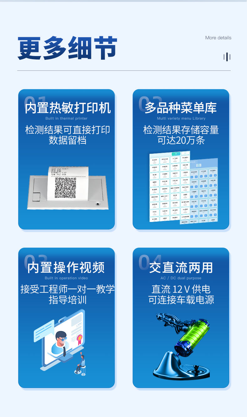 | 儀器采用10.1英寸液晶觸摸屏顯,搭配運(yùn)行安卓智能操作系統(tǒng),主控芯片采用ARM Cortex-A7,RK3288/4核處理器,主頻1.88Ghz,運(yùn)轉(zhuǎn)速度更快速,性能更強(qiáng)。 | 儀器功能包括:膠體金檢測(cè)模塊、數(shù)字化管理模塊、無(wú)線通訊模塊等,可以滿足同一軟件下實(shí)現(xiàn)所有檢測(cè)項(xiàng)目的檢測(cè),并在同一窗口展示檢測(cè)結(jié)果。 | 一體化便攜式快檢設(shè)備,采用交直流兩用供電方式,可連接車載電源,配備6ah大容量充電鋰電池,可以滿足現(xiàn)場(chǎng)及流動(dòng)檢測(cè)使用的需求。儀器尺寸:43×35×20cm, 主機(jī)凈重:5.1kg | 系統(tǒng)自帶數(shù)據(jù)集成模塊,設(shè)備首頁(yè)自動(dòng)統(tǒng)計(jì)檢測(cè)數(shù)據(jù)包含:周檢測(cè)數(shù)據(jù)、月檢測(cè)數(shù)據(jù),全部檢測(cè)總數(shù)量,均包含檢測(cè)總數(shù),合格數(shù),不合格數(shù),以及相關(guān)柱形分析圖,對(duì)各項(xiàng)檢測(cè)數(shù)據(jù)清晰掌握,無(wú)需電腦查詢,更加快捷直觀。 | 儀器具有任務(wù)預(yù)設(shè)模塊,可在樣品送檢前提前預(yù)設(shè)樣品名稱、檢測(cè)指標(biāo)、送檢單位等信息,樣品送檢時(shí)一鍵調(diào)取保存信息,檢測(cè)更加方便快捷。 | 膠體金檢測(cè)模塊:軌道式自動(dòng)傳輸掃描方式,可實(shí)時(shí)顯示金標(biāo)卡實(shí)時(shí)圖像,系統(tǒng)自動(dòng)分析并呈現(xiàn)出CT曲線圖,CT線自動(dòng)識(shí)別,無(wú)需手動(dòng)調(diào)整,完成檢測(cè)后自動(dòng)退出檢測(cè)卡。 結(jié)果判定線可修改,對(duì)照值標(biāo)定值可保存,斷電不丟失數(shù)據(jù)。 兼容市場(chǎng)上其他膠體金卡,使用耗材不受限制,極大增強(qiáng)用戶使用體驗(yàn)。 | 儀器檢測(cè)系統(tǒng)擁有龐大數(shù)據(jù)庫(kù),并且構(gòu)建了完善的檢索、修訂功能。食品庫(kù)涵蓋多種樣品名稱,可按需添加或刪除、編輯樣品名稱;產(chǎn)品數(shù)據(jù)庫(kù)以及歷史檢測(cè)記錄支持一鍵檢索功能。 | 系統(tǒng)打印自定義化,打印格式多樣化,產(chǎn)品合格證(國(guó)家標(biāo)準(zhǔn)要求),二維碼,抽樣信息、檢測(cè)信息,受檢信息、復(fù)核信息、抽樣日期、檢測(cè)日期等信息結(jié)果,可按需求自行設(shè)置打印內(nèi)容。 | A4紙版本報(bào)告打印功能(可選配):設(shè)備擁有兩種結(jié)果展示方式,可以自動(dòng)生成A4打印模板和小票打印模板兩種樣式,可通過(guò)WiFi及網(wǎng)線等方式鏈接外置打印機(jī)可進(jìn)行打印 | 儀器具有 wifi 聯(lián)網(wǎng)上傳、RJ45網(wǎng)線連接功能,可以快速上傳數(shù)據(jù)。同步對(duì)接監(jiān)管平臺(tái),數(shù)據(jù)可局域網(wǎng)和互聯(lián)網(wǎng)數(shù)據(jù)上傳,檢測(cè)結(jié)果直接傳至食品安全監(jiān)管平臺(tái)。進(jìn)行區(qū)域食品安全監(jiān)管及大數(shù)據(jù)分析處理與數(shù)據(jù)統(tǒng)計(jì),檢測(cè)區(qū)域食品安全長(zhǎng)短期動(dòng)態(tài),達(dá)到食品安全問(wèn)題預(yù)估、預(yù)警。 | 設(shè)備支持U盤(pán)存儲(chǔ),標(biāo)準(zhǔn)USB接口,免驅(qū)動(dòng)安裝。檢測(cè)結(jié)果存儲(chǔ)容量20萬(wàn)條以上,可生成Excel表格,進(jìn)行一鍵拷貝,并具有登錄保護(hù)功能,可設(shè)置用戶名及密碼,規(guī)范不同人員操作權(quán)限,防止非工作人員操作,并且可以進(jìn)行重新校準(zhǔn)、鎖定、恢復(fù)出廠設(shè)置功能。儀器固件可升級(jí),后期檢測(cè)項(xiàng)目可擴(kuò)充。 | 儀器具備遠(yuǎn)程升級(jí)功能,可定向分客戶分儀器更新,開(kāi)機(jī)后自動(dòng)更新,并可持續(xù)性免費(fèi)更新系統(tǒng)版本,無(wú)需像傳統(tǒng)產(chǎn)品返廠更新,節(jié)省時(shí)間及人力成本并避免了物流運(yùn)輸返廠升級(jí)導(dǎo)致設(shè)備損壞的潛在風(fēng)險(xiǎn)。 |