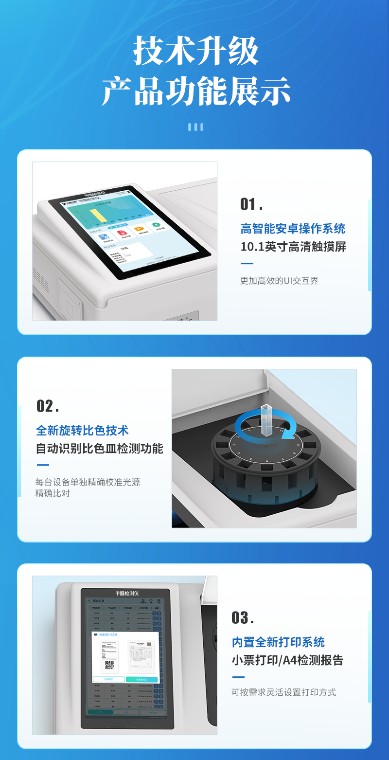 | 儀器采用臺式一體化系統(tǒng)檢測技術(shù),將分光光度模塊、新型農(nóng)殘檢測模塊、數(shù)字化管理模塊、無線通訊模塊高度集成于一體,支持檢測200種食品安全檢測項目,同時預留升級檢測方法。 | 儀器檢測模塊標準化、智能化,可隨意自由組合。檢測箱體內(nèi)置多個標準檢測單元,檢測模塊可以調(diào)整配置。 | 儀器采用全新安卓智能系統(tǒng),主控芯片采用 ARM Cortex-A7,RK3288/4核處理器,10.1寸高清液晶觸摸豎屏,更加**的UI交互界面,運轉(zhuǎn)快捷;儀器配備無線通信模塊: 4G(APN)通訊模塊、Wifi模塊,藍牙傳輸,同時具有雙USB接口以及RJ45接口能以多種方式實現(xiàn)數(shù)據(jù)保存和數(shù)據(jù)傳輸功能。 | 創(chuàng)新檢測模式: | ★檢測通道:≥12通道;采用精密旋轉(zhuǎn)比色池設(shè)計,使用同芯片同光源校準精度,解決不同光源之間的誤差值。1-12通道間誤差0.1%。(**號:ZL202022821055.2) | ★儀器具有自動識別比色皿檢測功能,即:將樣品比色皿放入儀器后,點擊樣品檢測,儀器自動識別比色皿進行通道檢測。 | 進口高精光源: | 高精度進口四波長冷光源,通道配置 410、520、590、630nm 波長光源,一個光源芯片驅(qū)動一個光源,誤差極小,每臺設(shè)備單獨**校準光源,**比對,同時參照四種不同波段光源全方位覆蓋市面上99%的農(nóng)殘食品項目檢測。 | 智能化操作系統(tǒng): | 便捷操作系統(tǒng):設(shè)備檢測時可在同一檢測界面自動對應(yīng)相關(guān)檢測通道一次性選擇1-12個樣品名稱,無須退出界面,節(jié)省操作時間。 | 數(shù)據(jù)集成系統(tǒng):設(shè)備首頁自動統(tǒng)計檢測數(shù)據(jù)包含:周檢測數(shù)據(jù)、月檢測數(shù)據(jù),全部檢測總數(shù)量,均包含檢測總數(shù),合格數(shù),不合格數(shù),以及相關(guān)柱形分析圖,對各項檢測數(shù)據(jù)清晰掌握,無需電腦查詢,更加快捷直觀。 | 項目預設(shè)系統(tǒng):支持添加單個及多個相同或不相同的任務(wù)預設(shè),一鍵快速調(diào)取,每一個任務(wù)分別可以設(shè)置不同的樣品、批次、編號、來源、備注、抽樣信息、檢測信息、受檢信息、復核信息等更多信息。無縫鏈接平臺和APP實時查看下發(fā)任務(wù)。 | 數(shù)據(jù)監(jiān)管系統(tǒng):同步對接監(jiān)管平臺,數(shù)據(jù)可局域網(wǎng)和互聯(lián)網(wǎng)數(shù)據(jù)上傳,檢測結(jié)果可選擇直接傳至食品安全監(jiān)管平臺。集成OSS輸出存儲服務(wù)、區(qū)分設(shè)備定向管理應(yīng)用,進行區(qū)域食品安全監(jiān)管及大數(shù)據(jù)分析處理與數(shù)據(jù)統(tǒng)計,檢測區(qū)域食品安全長短期動態(tài),達到食品安全問題預估、預警。 | 自定義打印系統(tǒng):內(nèi)置全新打印系統(tǒng),新創(chuàng)自定義打印方式,可按需靈活設(shè)置開啟或關(guān)閉:產(chǎn)品合格證(國家農(nóng)業(yè)部標準要求),二維碼,抽樣信息、檢測信息,受檢信息、復核信息、抽樣日期、檢測日期等信息的打印。 | 系統(tǒng)遠程更新功能:可定向分客戶分儀器更新系統(tǒng),按照不同客戶后期實際需求添加項目,無需機器返廠,即可遠程實時升級全新系統(tǒng),節(jié)省時間成本及避免運輸造成設(shè)備損壞。 | 儀器主機采用一體化防水、抗壓、防撞擊、防腐蝕箱體設(shè)計,同時配備交直流供電,可連接車載電源,可選配大容量充電鋰電池,滿足現(xiàn)場野外檢測需求。 | 安全證書,放心保障:儀器具有中國計量科學研究院校準證書,**認證。 |
