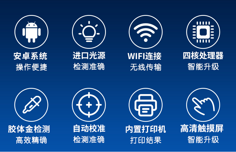 | 七寸彩屏全觸摸輸入,支持手寫(xiě)功能支持WIFI,支持3G、4G; | 支持金標(biāo)項(xiàng)目檢測(cè)定性檢測(cè),結(jié)果可顯示樣品陰陽(yáng)性結(jié)果 | 內(nèi)置智能操作系統(tǒng)軟件內(nèi)置大容量存儲(chǔ)數(shù)據(jù)庫(kù),可隨時(shí)分類(lèi)查詢已測(cè)項(xiàng)目; | ☆數(shù)據(jù)可局域網(wǎng)和互聯(lián)網(wǎng)數(shù)據(jù)上傳,可構(gòu)建食品安全監(jiān)管系統(tǒng)平臺(tái),支持LIMS 系統(tǒng),內(nèi)置USB接口,可擴(kuò)展外設(shè); | ☆自動(dòng)精準(zhǔn)識(shí)別CT線位置,糾錯(cuò)范圍可達(dá)±3mm; | 支持金標(biāo)項(xiàng)目檢測(cè)定性檢測(cè),結(jié)果可顯示樣品陰陽(yáng)性結(jié)果; | 檢測(cè)響應(yīng)時(shí)間:< 3S | 讀數(shù)精度:CV<1% ; | 12V低壓電源供電,便攜式設(shè)計(jì),適合野外,車(chē)載或室內(nèi)等各種場(chǎng)所使用 |