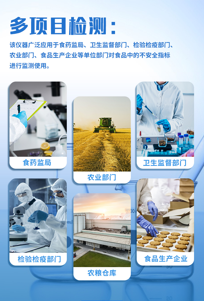 金標(biāo)度數(shù)儀快速定量檢測(cè)獸藥殘留、抗生素類(lèi)殘留、激素類(lèi)殘留、毒素類(lèi)殘留,化學(xué)類(lèi)殘留等幾十種項(xiàng)目并可根據(jù)用戶需要擴(kuò)充新的檢測(cè)項(xiàng)目如農(nóng)藥殘留、食品添加劑、色素、可現(xiàn)場(chǎng)快速檢測(cè)農(nóng)藥殘留、鹽酸克倫特羅、沙丁胺醇、萊克多巴胺、四環(huán)素類(lèi)、硝基呋喃類(lèi)、磺胺類(lèi)、沙星類(lèi)、氯霉素、孔雀石綠磺胺類(lèi)、豬藍(lán)耳病毒、豬瘟病毒、黃曲霉毒素B1、豬偽狂犬病毒、豬偽狂犬病毒gE蛋白、豬口蹄疫3ABC蛋白、豬口蹄疫病毒IgG、豬細(xì)小病毒、雞禽流感等定性和定量快速檢測(cè)等、并且可以連接食品安全監(jiān)控系統(tǒng)。