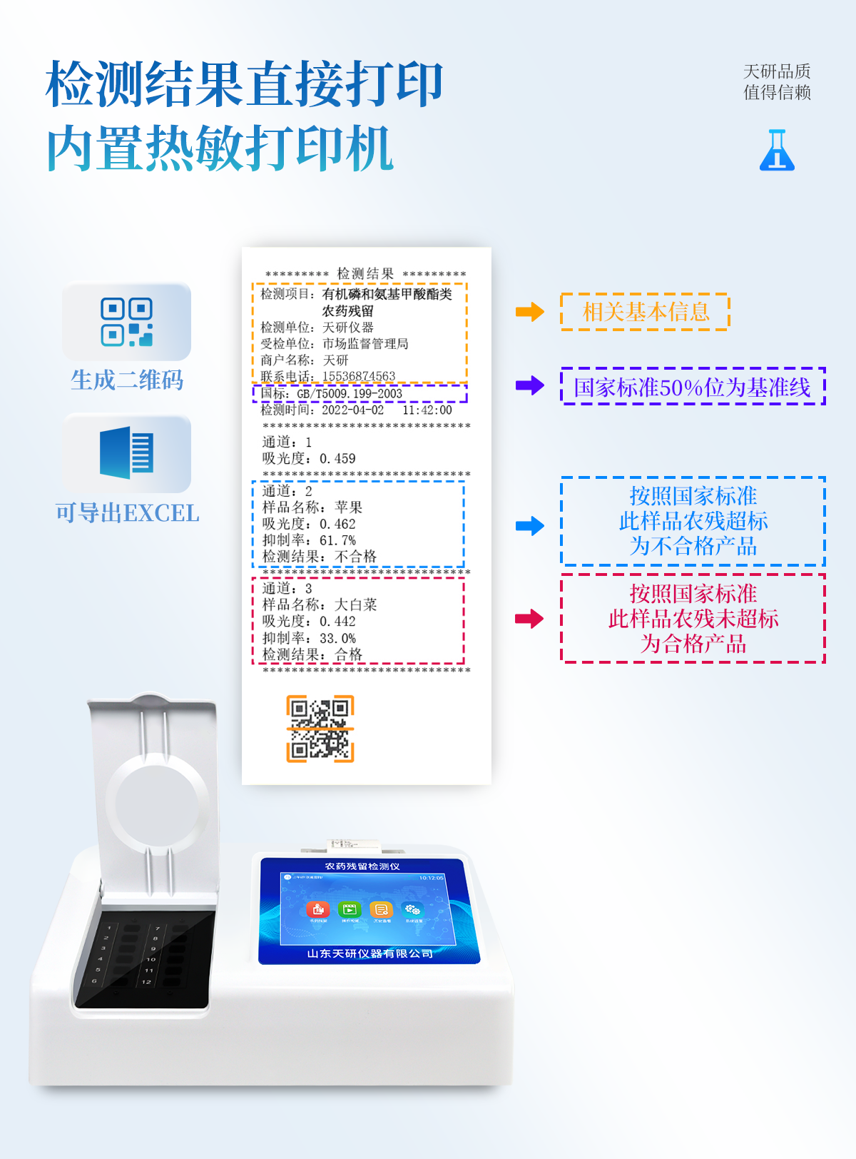 | 乙酰膽堿酯酶和丁酰膽堿酯酶試劑均可以使用,符合國家標準和農業(yè)部標準的要求。 | 自動判斷樣品是否合格,檢測結果更加直觀。 | 儀器具有100多種蔬菜名稱菜單庫,分類管理,并可按需添加或刪除蔬菜名,編輯蔬菜名稱,可直接打印出蔬菜名稱。 | 檢測通道:12個檢測通道,可以同時測試多個樣品,循環(huán)檢測,即放即檢,每個樣品由程序控制分別獨立工作,不會互相干擾。 | 智能操作系統(tǒng),采用更加人性化操作,主控采用多核處理器,主頻1.88Ghz,運轉速度更快速,穩(wěn)定性更強。 | 顯示方式:7英寸高靈敏真彩觸摸屏顯示,人性化中文操作界面,讀數(shù)直觀、簡單。 | 打印機采用串口5v打印,可選擇手動打印或者自動打印,三分鐘出打印結果,打印格式為檢測人姓名、吸光度差值、檢測時間、檢測機構、樣品名稱及結果判定。 | 光源采用進口超高亮發(fā)光二極管,具有低功耗、高精度、穩(wěn)定性強、光源可控可以關掉不使用的光源,響應速度快等優(yōu)點。 | 智能恒流穩(wěn)壓,光強自動校準,長時間連續(xù)工作光源無溫漂現(xiàn)象。 | 儀器具有GPRS遠傳功能,可插手機卡實現(xiàn)數(shù)據(jù)遠傳平臺,wifi聯(lián)網(wǎng)功能,可將數(shù)據(jù)快速上傳電腦,進行數(shù)據(jù)管理與統(tǒng)計。 | 采用USB2.0接口設計,方便數(shù)據(jù)的存貯和移動,并可隨時與計算機直接相連,并且可用計算機控制儀器。實現(xiàn)數(shù)據(jù)查詢、瀏覽、分析、統(tǒng)計、打印等。 | 智能化程度高,儀器具有自檢功能:具有開機自檢和調零功能,具有自動檢測重復性功能 | 儀器具有自身保護功能,可設置用戶名及密碼,防止非工作人員操作等。 | 采用DC12v直流供電,安全系統(tǒng)更高,并且配備6A鋰電池充電器。 | 儀器具有重新校準、鎖定、恢復出廠設置功能。 |