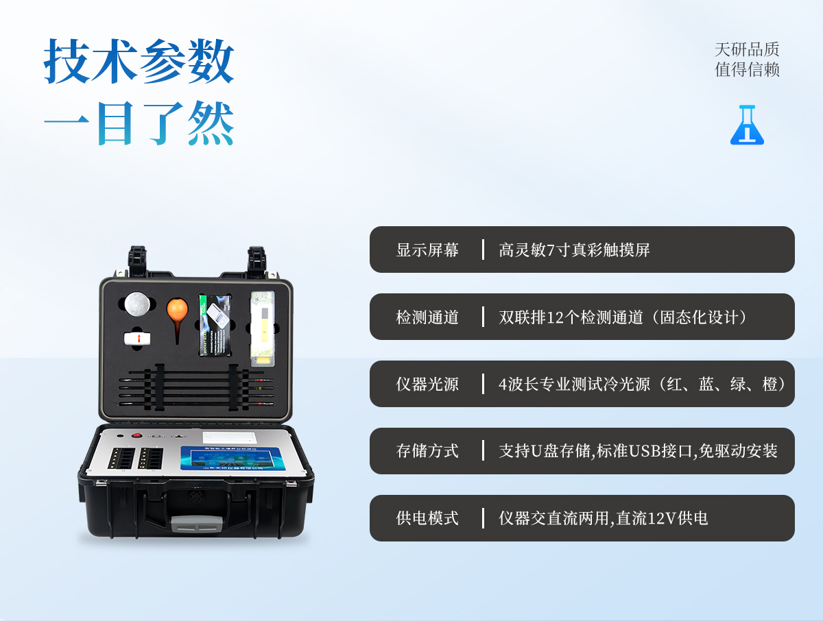 | 配套齊全:該儀器集藥、器、儀為一體,攜帶方便,相當于一個小型移動實驗室,無需用戶自配附件,亦可靈活野外流動測試。適于農(nóng)業(yè)服務部門或農(nóng)資經(jīng)銷商、合作社、肥料廠商、大種植戶測土施肥。 | 檢測功能全:測試項目國內(nèi)外全面,除標配試劑外,其他各類藥劑均可加配選購。 | 操作簡便、速度快捷,配套整套附件及成品藥劑開瓶即用,無須配置。 |