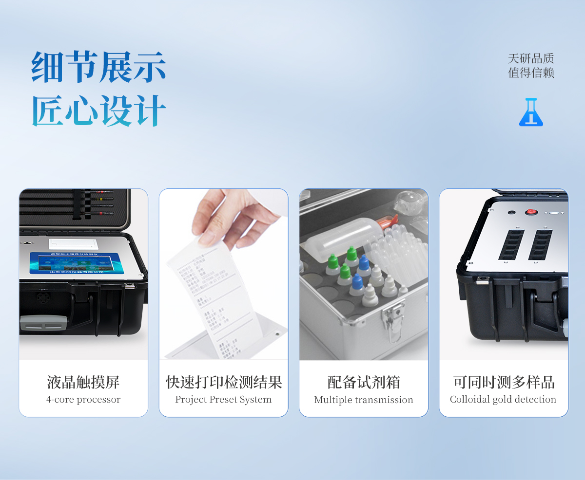 | 1、本儀器集各功能于一身,無需用戶自配附件,可靈活流動檢測。 | 2、安卓(Android)智能操作系統(tǒng),主控芯片采用ARM Cortex-A7,RK3288/4核處理器,主頻1.88Ghz,運轉(zhuǎn)速度更快速,穩(wěn)定性更強。 | 3、雙聯(lián)排12個檢測通道(固態(tài)化設(shè)計),一次性可快速檢測12個樣品,極大提升檢測效率,降低檢測成本。 | 4、檢測過程中內(nèi)置校準功能,智能恒流穩(wěn)壓,光強自動校準,確保檢測準確度。 | 5、內(nèi)置作物專家施肥系統(tǒng),可對百余種全國農(nóng)業(yè)經(jīng)濟作物、果樹等的目標產(chǎn)量計算推薦施肥量,依據(jù)施肥配方科學指導農(nóng)業(yè)生產(chǎn)。測土配方施肥結(jié)果可打印,打印內(nèi)容包含:作物種類、肥料種類、目標產(chǎn)量、需求總量、建議施肥方案。 | 6、儀器標配wifi無線上傳、4G聯(lián)網(wǎng)傳輸、GPRS無線遠傳功能,快速上傳數(shù)據(jù)。 | 7、儀器內(nèi)置大容量內(nèi)存,支持查看全部歷史檢測記錄,以及傳輸所有檢測數(shù)據(jù)。 | 8、配有智慧云農(nóng)業(yè)平臺,儀器連入無線網(wǎng)絡后,可將檢測數(shù)據(jù)可選擇性或批量無線上傳,方便用戶進行長期數(shù)據(jù)管理和可視化分析。 | 9、儀器配同時具有USB接口、以太網(wǎng)接口,并可隨時用U盤拷貝出數(shù)據(jù)。 | 10、可用手機隨時登錄云平臺在線移動查看歷史數(shù)據(jù) | 11、內(nèi)置植物營養(yǎng)診斷標準圖譜,根據(jù)各農(nóng)作物營養(yǎng)缺失的圖片,進行葉面對比,診斷豐缺。 | 12、4波長專業(yè)測試冷光源(紅、藍、綠、橙),光源波長穩(wěn)定,長時間連續(xù)工作光源無溫漂現(xiàn)象,壽命長達10萬小時級別,重現(xiàn)性好,準確度高。 | 13、比色池部分采用標準1cm比色皿,無機械位移及磨損,光路測試定位**,有效屏蔽外光干擾,保證檢測結(jié)果優(yōu)于國標要求。 | 14、儀器系統(tǒng)內(nèi)帶有樣品前處理操作視頻,各種樣品檢測方法點擊視頻模塊即可觀看,檢測人員無需自學說明書,指導教學方便快速,方便新手快速操作。 | 15、內(nèi)置新一代高速熱敏打印機(無需色帶),打印內(nèi)容包含:檢測單位、檢測人員、檢測項目、通道號、吸光度、養(yǎng)分含量(mg/kg)、檢測時間、以及二維碼等信息 | 16、高靈敏7寸真彩觸摸屏,采用更加**和人性化操作,高清晰高交互顯示,大程度降低傳統(tǒng)儀器的繁瑣操作和失誤。 | 17、內(nèi)置時鐘功能,方便操作時間記錄,長期歷史追溯。 | 18、可設(shè)置多賬戶賬號密碼登錄,**UI交互界面,不同的用戶可自由添加編輯檢測信息,保存后可長期使用。 | 19、GPS功能:可在野外作業(yè)時記錄經(jīng)緯度地點,滿足特殊用戶需求。 | 20、內(nèi)置低電壓提示功能,可在檢測時明確電量,避免測試數(shù)據(jù)偏移,同時具有斷電保護功能,斷電自動保存數(shù)據(jù),防止數(shù)據(jù)丟失。 | 21、交直流兩用供電方式,內(nèi)置大容量充電鋰電池,滿電狀態(tài)下可連續(xù)工作10余小時,同時可外接車載電源蓄電。 | 22、儀器具有中英文切換功能,可滿足出口要求。 | 23、高強度PVC工程塑料手提箱設(shè)計,堅固耐用,便于攜帶。 |