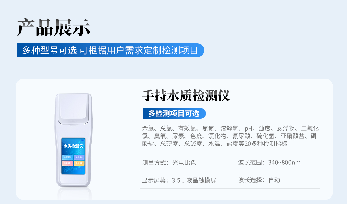 適用于純凈水廠、自來水廠、生活污水處理廠、工業(yè)污水、水產養(yǎng)殖、河流監(jiān)測、游泳場館、水源保護、生產監(jiān)測、科研實驗等。