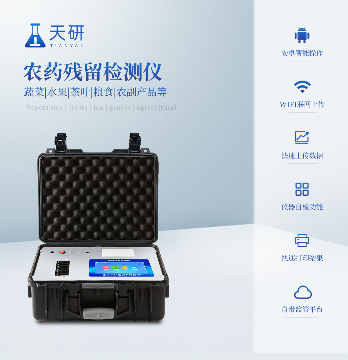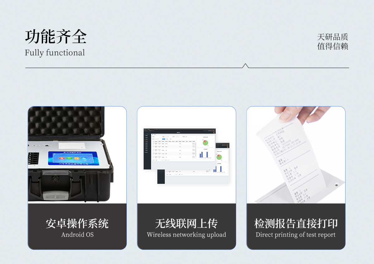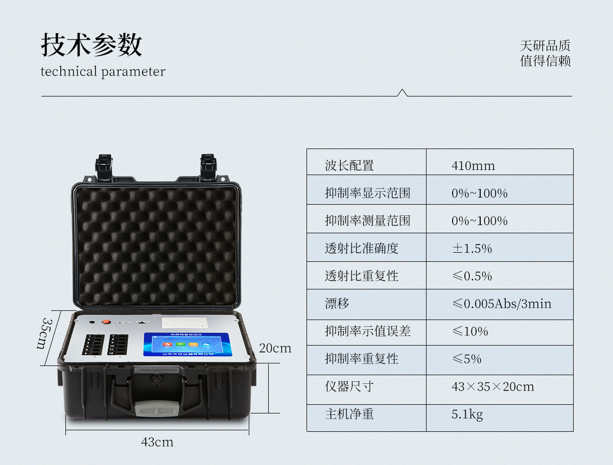 | 機(jī)箱采用工業(yè)級ABS工程塑料箱,方便攜帶,穩(wěn)固耐用,便于流動測試。 | 智能操作系統(tǒng),采用更加人性化操作,主控采用多核處理器,主頻1.88Ghz,運轉(zhuǎn)速度更快速,穩(wěn)定性更強。 | 自動判斷樣品是否合格,檢測結(jié)果更加直觀。 | 儀器具有100多種蔬菜名稱菜單庫,分類管理,并可按需添加或刪除蔬菜名,編輯蔬菜名稱,可直接打印出蔬菜名稱。 | 檢測通道:12個檢測通道,可以同時測試多個樣品,循環(huán)檢測,即放即檢,每個樣品由程序控制分別獨立工作,不會互相干擾。 | 儀器具有wifi聯(lián)網(wǎng)功能,可將數(shù)據(jù)快速上傳電腦,進(jìn)行數(shù)據(jù)管理與統(tǒng)計,4G信號GPRS遠(yuǎn)傳功能,可插手機(jī)卡實現(xiàn)數(shù)據(jù)遠(yuǎn)傳平臺,。 | 顯示方式:7英寸高靈敏真彩觸摸屏顯示,人性化中文操作界面,讀數(shù)直觀、簡單。 | 打印機(jī)采用串口5v打印,可選擇手動打印或者自動打印,三分鐘出打印結(jié)果,打印格式為檢測人姓名、吸光度差值、檢測時間、檢測機(jī)構(gòu)、樣品名稱及結(jié)果判定。 | 光源采用進(jìn)口超高亮發(fā)光二極管,具有低功耗、高精度、穩(wěn)定性強、光源可控可以關(guān)掉不使用的光源,響應(yīng)速度快等優(yōu)點。 | 智能恒流穩(wěn)壓,光強自動校準(zhǔn),長時間連續(xù)工作光源無溫漂現(xiàn)象。 | 采用USB2.0接口設(shè)計,方便數(shù)據(jù)的存貯和移動,并可隨時與計算機(jī)直接相連,并且可用計算機(jī)控制儀器。實現(xiàn)數(shù)據(jù)查詢、瀏覽、分析、統(tǒng)計、打印等。 | 智能化程度高,儀器具有自檢功能:具有開機(jī)自檢和調(diào)零功能,具有自動檢測重復(fù)性功能 | 儀器具有自身保護(hù)功能,可設(shè)置用戶名及密碼,防止非工作人員操作等。 | 采用DC12v直流供電,安全系統(tǒng)更高,并且配備6A鋰電池充電器。 | 儀器具有重新校準(zhǔn)、鎖定、恢復(fù)出廠設(shè)置功能。 |