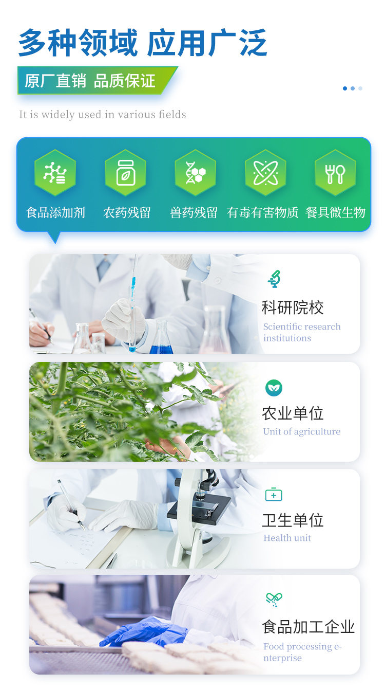 | 食品添加劑:二氧化硫、雙氧水、亞硝酸鹽、硝酸鹽、苯甲酸鈉、山梨酸鉀、糖精鈉、甜蜜素、木耳硫酸鎂等 | 有毒有害物質(zhì):甲醛、吊白塊、硼砂、過氧化苯甲酰、溴酸鉀、羅丹明B、三聚氰胺、蘇丹紅、工業(yè)堿、尿素、明礬等 | 果蔬:農(nóng)藥殘留(酶抑制率法) | 病害肉:組胺、揮發(fā)性鹽基氮 | 重金屬含量:鉛、鎘、鉻、汞、砷、錫、鎳、鋁等 | 水產(chǎn)品安全類:孔雀石綠、氯霉素、呋喃妥因、呋喃西林、呋喃它酮、呋喃唑酮等 | 瘦肉精激素類(獸藥):鹽酸克倫特羅、沙丁胺醇、萊克多巴胺、己烯雌酚等 | 抗生素殘留:四環(huán)素類、硝基呋喃類、磺胺類、β-興奮劑類、沙星類、磺胺類、喹諾酮類,甲砜霉素,氟苯尼考,金剛烷胺、替米考星、慶大霉素、林可霉素、鏈霉素、恩諾沙星、環(huán)丙沙星、頭孢啦啶、青霉素、阿莫西林等 | 真菌毒素類:食用油、糧食及飼料中黃曲霉毒素B1、黃曲霉毒素總量,奶中黃曲霉毒素M1、嘔吐毒素、玉米赤霉烯酮、赭曲霉毒素A、T2毒素、伏馬毒素等 | 水酒飲品分析:乳品及牛奶中蛋白質(zhì);酒中甲醇、乙醇、雜醇油;蜂蜜中果糖和葡萄糖、蔗糖、淀粉酶、酸度;水中氰化物、余氯,飲料中維C等 | 調(diào)味品成分: 食醋的總酸、醬油的總酸、芝麻油純度、谷氨酸鈉、醬油氨基酸態(tài)氮、食鹽中亞鐵氰化鉀、食鹽中碘等 | 食用色素類:紅色色素(胭脂紅、莧菜紅、莧菜紅)、黃色色素(檸檬黃、日落黃)、藍(lán)色色素(亮藍(lán))等 | 動(dòng)物疫病類:禽流感、新城疫、牛羊口蹄疫、牛羊結(jié)核病、牛羊包蟲、牛羊布病、小反芻獸、豬藍(lán)耳病毒、豬瘟病毒、豬偽狂犬病毒、豬細(xì)小、豬圓環(huán)、犬細(xì)小病毒、犬瘟熱病毒、犬狂犬病毒等 | 蜂蜜成分:果糖和葡萄糖、蔗糖、淀粉酶、酸度等 | 水產(chǎn)品安全類:孔雀石綠、氯霉素、呋喃妥因、呋喃西林、呋喃它酮、呋喃唑酮等 | 食用油脂:過氧化值、酸價(jià)等 | 蛋類藥物殘留:氯霉素,四環(huán)素,磺胺類,喹諾酮類,呋喃西林,呋喃它酮,呋喃妥因,呋喃唑酮,氟苯尼考,阿莫西林、頭孢氨芐、紅霉素、鏈霉素等 |