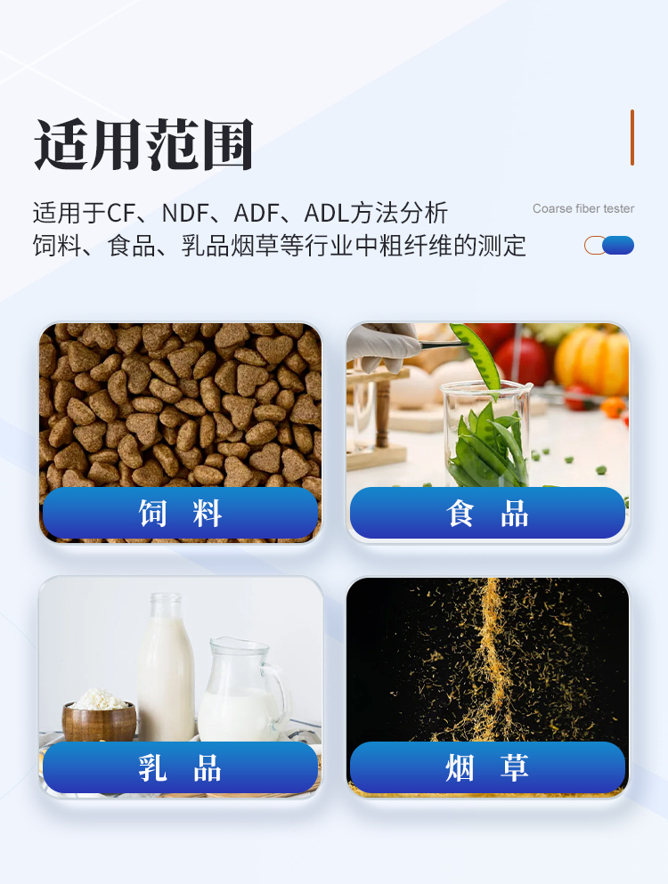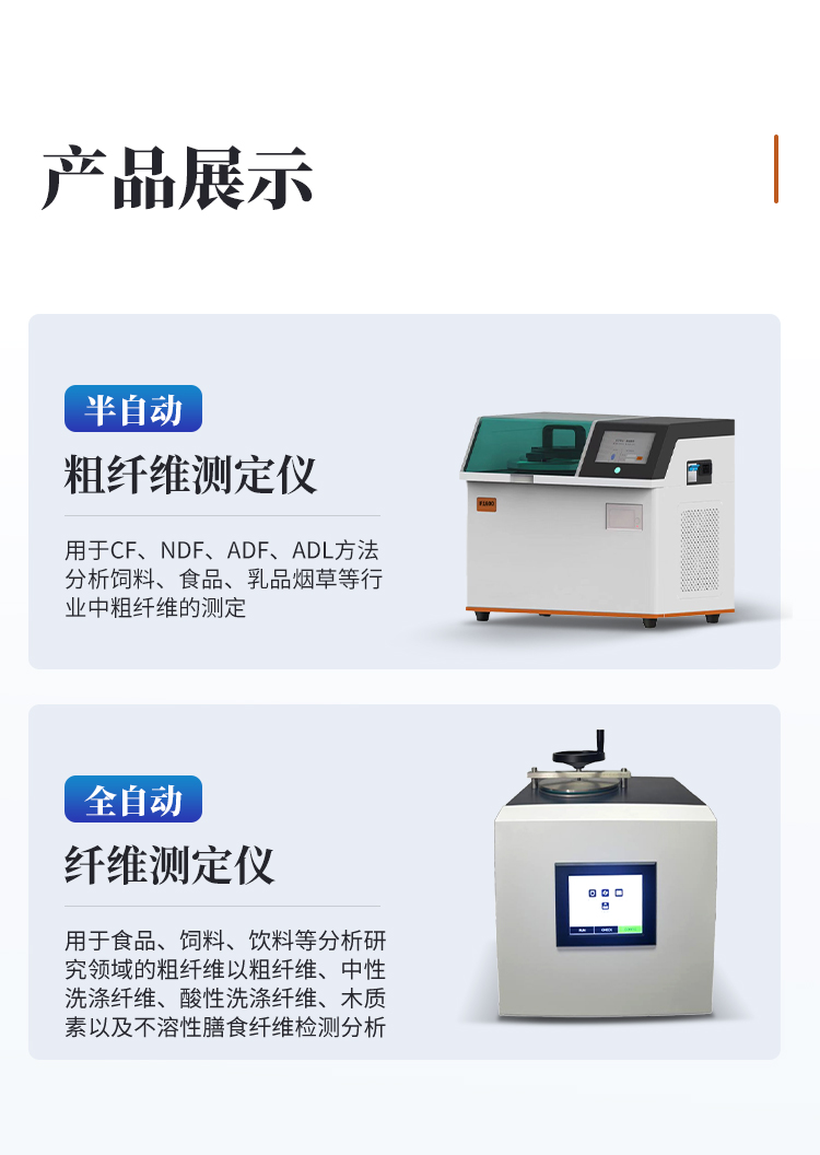 適用于食品、飼料、飲料等分析研究領(lǐng)域的粗纖維以粗纖維、中性洗滌纖維、酸性洗滌纖維、木質(zhì)素以及不溶性膳食纖維檢測(cè)分析。