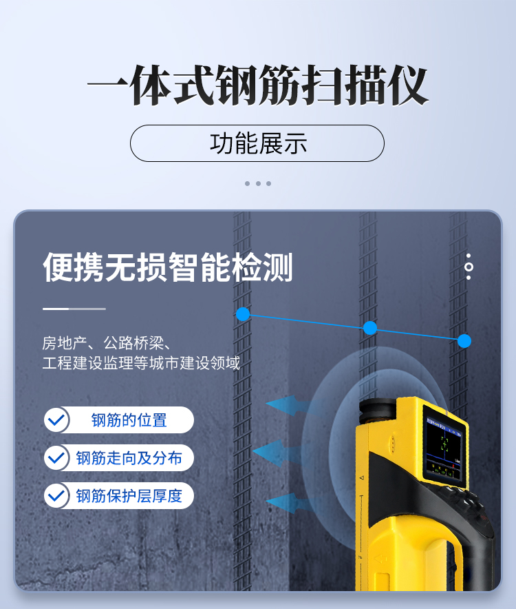 | 檢測混凝土結(jié)構(gòu)中鋼筋的位置及走向 | 檢測鋼筋的保護層厚度 | 探明結(jié)構(gòu)中其它磁性物體的分布 | 探頭自校正功能 |