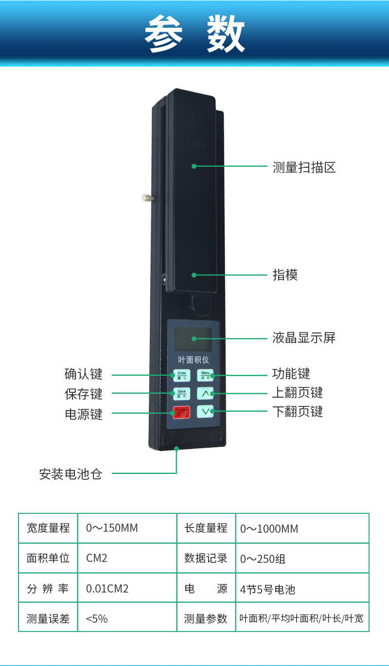| (1)面積單位:cm2 | (2)分辨率:0.01cm2 | (3)測(cè)量誤差:<5% | (4)寬度量程:0~150mm | (5)長度量程:0~1000mm | (6)數(shù)據(jù)記錄:0~250組 | (7)電源:4節(jié)5號(hào)電池 |