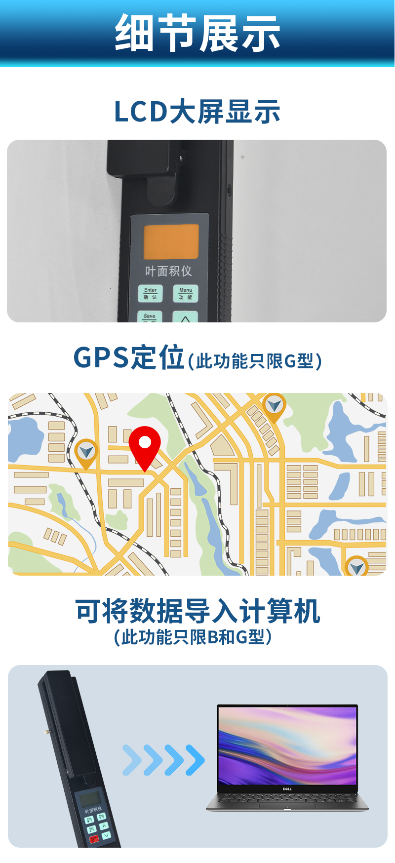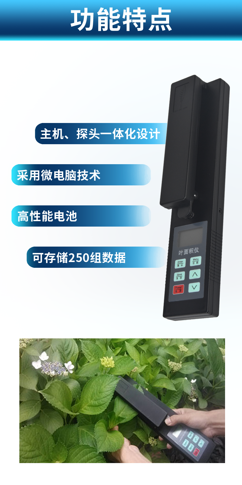 | 1)主機(jī)、探頭一體化設(shè)計(jì),更方便操作。 | 2)采用微電腦技術(shù),LCD大液晶顯示。 | 3)高性能電池,無需外部供電,低電壓顯示,更適用于野外測(cè)量。 | 4)一次性可測(cè)量較大葉片面積(1000*155mm2) | 5)可存儲(chǔ)250組數(shù)據(jù)(葉面積、葉長、葉寬)。 | 6)可測(cè)量葉片的多種參數(shù):葉面積、平均葉面積、葉長、葉寬。 | 7)通訊接口:RSR232接口,可將數(shù)據(jù)導(dǎo)入計(jì)算機(jī)。(此功能只限B和G型) | 8)GPS定位:集成高速GPS定位模塊,上傳數(shù)據(jù)都自帶時(shí)間、經(jīng)緯度信息,方便更有效的 |