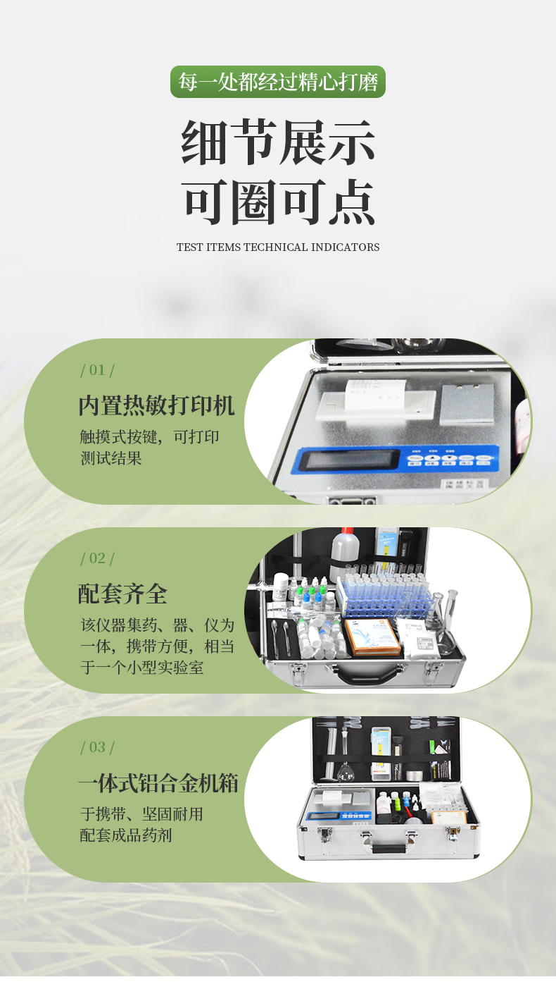 特點(diǎn): 《機(jī)箱/藥劑一體式鋁合金機(jī)箱》設(shè)計(jì),便于攜帶、堅(jiān)固耐用,配套成品藥劑。 微電腦控制,數(shù)字化線路、程序化設(shè)計(jì),液晶顯示,交直流兩用,可野外流動(dòng)測(cè)試,大程度降低操作者的失誤和勞動(dòng)強(qiáng)度。