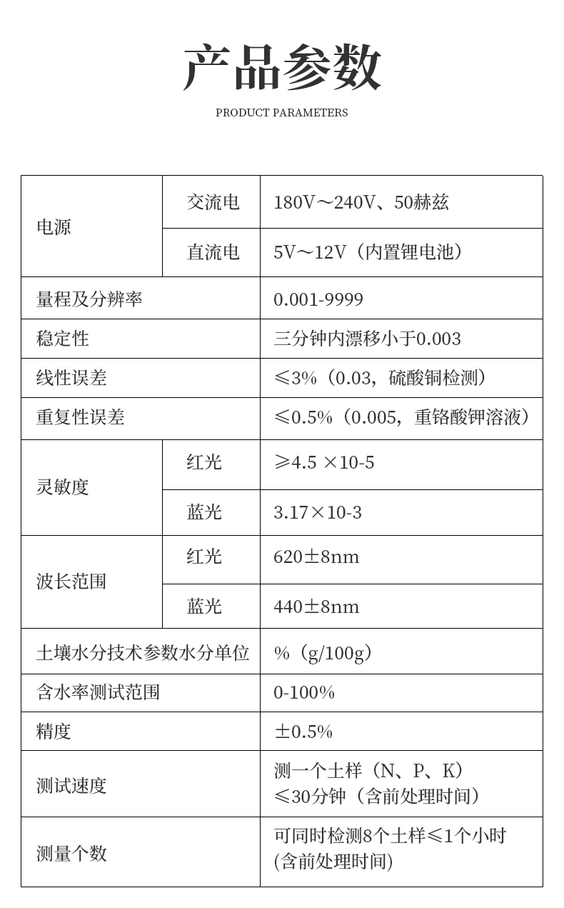 | 1.電源:交流電:180V~240V、50赫茲;直流電:12V+5V(可接車載電源) | 2.量程及分辨率:0.001-9999 | 3.穩(wěn)定性:三分鐘內(nèi)漂移小于0.003 | 4.線性誤差:≤3%(0.03,硫酸銅檢測(cè)) | 5.重復(fù)性誤差:≤0.5%(0.005,重鉻酸鉀溶液) | 6.靈敏度:紅光≥4.5 ×10-5 藍(lán)光≥3.17×10-3 | 7.波長(zhǎng)范圍:紅光620±8nm 藍(lán)光440±8nm | 8.土壤水分技術(shù)參數(shù)水分單位:﹪(g/100g)含水率測(cè)試范圍:0-100﹪ 精度:±0.5﹪ | 9.土壤中速效N、P、K三種養(yǎng)分一次性同時(shí)浸提測(cè)定、科學(xué)推薦施肥量 | 10. 肥料中氮(N)、磷(P)、鉀(K)等養(yǎng)分同時(shí)、快速、準(zhǔn)確檢測(cè) | 11.測(cè)試速度:測(cè)一個(gè)土樣(N、P、K)≤30分鐘(含前處理時(shí)間) | 12 .可同時(shí)檢測(cè)8個(gè)土樣≤1個(gè)小時(shí)(含前處理時(shí)間) | 13. 數(shù)據(jù)打?。簝?nèi)置高檔一鍵式熱敏打印機(jī)(國(guó)內(nèi)首家**設(shè)計(jì)) (**號(hào):ZL 2018 2 1777724.7) |