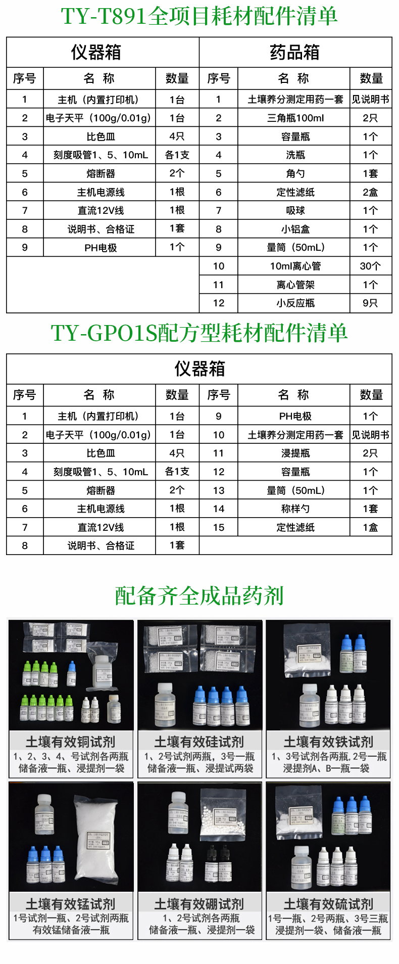 | 藥 品 箱 | 土壤養(yǎng)分測(cè)定用藥 :1套/100次 | 三角瓶100ml :2只 | 容量瓶 :1個(gè) | 洗瓶 :1個(gè) | 角勺 :1套 | 定性濾紙 :1盒 | 吸球 :1個(gè) | 小鋁盒 :1個(gè) | 量筒(50mL) :1個(gè) | 10ml離心管 :30個(gè) | 離心管架 :1個(gè) |