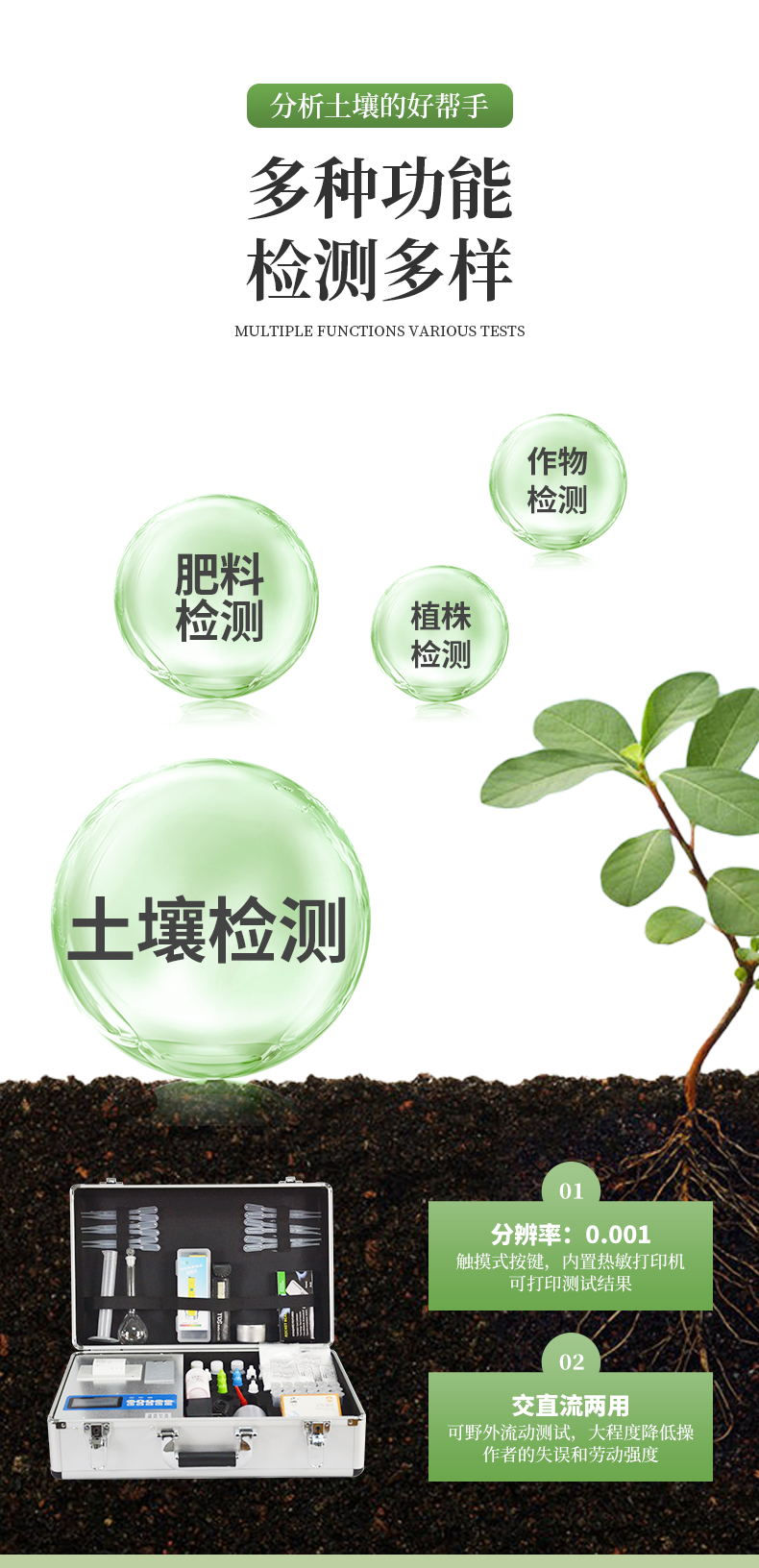 | 1、《機箱/藥劑一體式鋁合金機箱》設計,便于攜帶、堅固耐用,配套成品藥劑。 | 2、微電腦控制,數(shù)字化線路、程序化設計,液晶顯示,交直流兩用,可野外流動測試,大程度降低操作者的失誤和勞動強度。 | 3、分辨率:0.001,觸摸式按鍵,內置**熱敏打印機,可打印測試結果。 | 4、全項目土壤肥料養(yǎng)分檢測儀可檢測土壤及化肥、有機肥(含葉面肥、水溶肥、噴施肥等)、植株中的速效氮、速效磷、有效鉀、全氮、全磷、全鉀、有機質、酸堿度,鈣、鎂、硫、鐵、錳、硼、鋅、銅、氯、硅、鉬等各種中微量元素以及鉛、鉻、鎘、汞、砷、鎳、鋁、氟、鈦、硒等各種重金屬含量。 | 5、采用高亮LED燈光源、雙撥輪濾光式處理技術,保證光源波長穩(wěn)定, 硅半導體作為信號接收系統(tǒng), 壽命長達10萬小時級別。光源穩(wěn)定,重現(xiàn)性好,準確度高。 | 6、比色槽部分采用單通道設計,無機械位移及磨損,光路測試定位**,保證測定結果精度。 | 7、配套專家施肥系統(tǒng)數(shù)據,可對百余種全國農業(yè)、果樹、 經濟作物的目標產量科學計算推薦施肥量。 | 8、采用高精度濾光片技術自主**分析方法(**號:ZL 2018 2 1777724.7),保證檢測結果優(yōu)于國標要求。 |