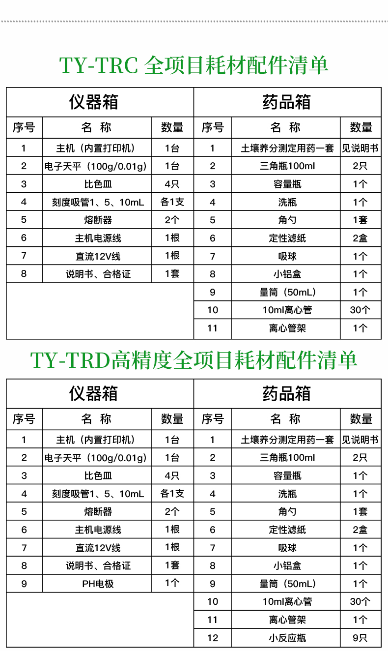 | 藥 品 箱 | 土壤養(yǎng)分測定用藥一套:見說明書 | 三角瓶100ml :2只 | 小反應瓶 :9只 | 容量瓶 :1個 | 洗瓶 :1個 | 角勺 :1套 | 定性濾紙 :2盒 | 吸球 :1個 | 小鋁盒 :1個 | 量筒(50mL) :1個 | 10ml離心管 :40個 | 離心管架 :1個 |