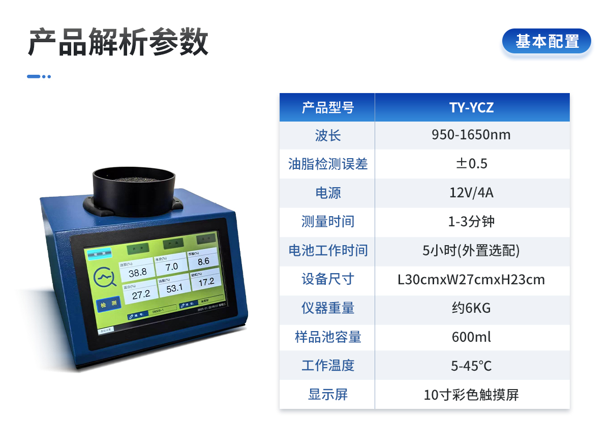 | 波長范圍:950-1650nm | 測(cè)量對(duì)象:顆粒、粉末、草料等固形物 | 測(cè)量時(shí)間:1~3 分鐘(因檢測(cè)對(duì)象及指標(biāo)而異) | 樣品池容量:600ml | 尺寸及重量:L30cm×W27cm×H23cm(含樣品池高度),6kg | 操作界面:10 寸彩色觸摸屏 | 供電電壓:12V/4A | 電池工作時(shí)間:5 小時(shí)(外置選配) | 工作溫度:5-45℃ | 油脂檢測(cè)誤差:+-0.5 |