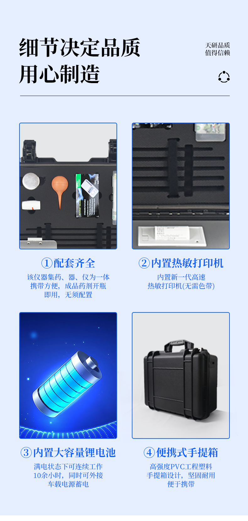 | Android安卓智能操作系統(tǒng),主控芯片采用ARM Cortex-A7,RK3288/4核處理器,主頻1.88Ghz,運(yùn)轉(zhuǎn)速度更快速,穩(wěn)定性更強(qiáng)。 | 采用精密旋轉(zhuǎn)比色池設(shè)計(jì),光源一致性更加**,保證檢測(cè)精度。 | 12個(gè)旋轉(zhuǎn)檢測(cè)通道,一次性可快速檢測(cè)12個(gè)樣品,極大提升檢測(cè)效率,降低檢測(cè)成本。 | 采用高精度濾光片技術(shù)自主**分析方法(**號(hào):ZL 2018 2 1777724.7),**認(rèn)證。 | 檢測(cè)過程中內(nèi)置校準(zhǔn)功能,智能恒流穩(wěn)壓,光強(qiáng)自動(dòng)校準(zhǔn),確保檢測(cè)準(zhǔn)確度。 | 儀器標(biāo)配wifi無線上傳、4G聯(lián)網(wǎng)傳輸、GPRS無線遠(yuǎn)傳,快速上傳數(shù)據(jù)。 | 配有云平臺(tái),儀器連入無線網(wǎng)絡(luò)后,可將檢測(cè)數(shù)據(jù)可選擇性或批量無線上傳,方便用戶進(jìn)行長(zhǎng)期數(shù)據(jù)管理和可視化分析。 | 儀器配同時(shí)具有USB接口、以太網(wǎng)接口,內(nèi)置大容量?jī)?nèi)存,并可隨時(shí)用U盤拷貝數(shù)據(jù)。 | 可用手機(jī)隨時(shí)登錄云平臺(tái)在線移動(dòng)查看歷史數(shù)據(jù) | 4波長(zhǎng)專業(yè)測(cè)試?yán)涔庠?紅、藍(lán)、綠、橙),光源波長(zhǎng)穩(wěn)定,長(zhǎng)時(shí)間連續(xù)工作光源無溫漂現(xiàn)象,壽命長(zhǎng)達(dá)10萬(wàn)小時(shí)級(jí)別,重現(xiàn)性好,準(zhǔn)確度高。 | 比色池部分采用標(biāo)準(zhǔn)1cm比色皿,無機(jī)械位移及磨損,光路測(cè)試定位**,有效屏蔽外光干擾,保證檢測(cè)結(jié)果優(yōu)于國(guó)標(biāo)要求。 | 儀器系統(tǒng)內(nèi)帶有樣品前處理操作視頻,各種樣品檢測(cè)方法點(diǎn)擊視頻模塊即可觀看,檢測(cè)人員無需自學(xué)說明書,指導(dǎo)教學(xué)方便快速,方便新手快速操作 | 內(nèi)置新一代高速熱敏打印機(jī)(無需色帶),打印內(nèi)容包含:檢測(cè)單位、檢測(cè)人員、檢測(cè)項(xiàng)目、通道號(hào)、吸光度、含量(mg/kg)、檢測(cè)時(shí)間、以及二維碼等信息 | 高靈敏7寸真彩觸摸屏,采用更加**和人性化操作,高清晰高交互顯示,大程度降低傳統(tǒng)儀器的繁瑣操作和失誤。 | 內(nèi)置時(shí)鐘功能,方便操作時(shí)間記錄,長(zhǎng)期歷史追溯。 | 可設(shè)置多賬戶賬號(hào)密碼登錄,**UI交互界面,不同的用戶可自由添加編輯檢測(cè)信息,保存后可長(zhǎng)期使用。 | GPS功能:可在野外作業(yè)時(shí)記錄經(jīng)緯度地點(diǎn),滿足特殊用戶需求。 | 內(nèi)置低電壓提示功能,可在檢測(cè)時(shí)明確電量,避免測(cè)試數(shù)據(jù)偏移,同時(shí)具有斷電保護(hù)功能,斷電自動(dòng)保存數(shù)據(jù),防止數(shù)據(jù)丟失。 | 交直流兩用供電方式,內(nèi)置大容量充電鋰電池,滿電狀態(tài)下可連續(xù)工作10余小時(shí),同時(shí)可外接車載電源蓄電。 | 儀器具有中英文切換功能,可滿足出口要求。 | 高強(qiáng)度PVC工程塑料手提箱設(shè)計(jì),堅(jiān)固耐用,便于攜帶。 |