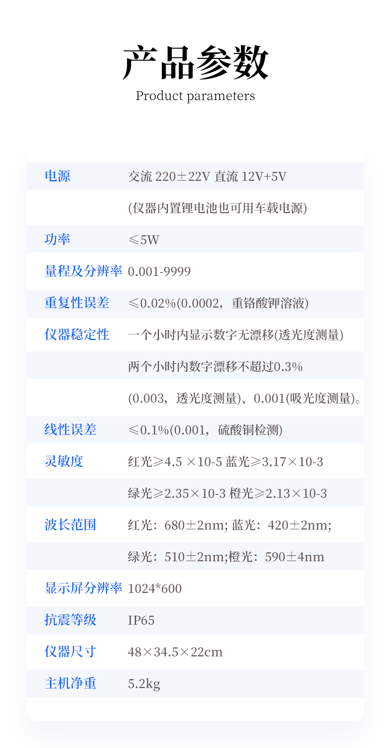 | 電源:交流 220±22V 直流 12V+5V(儀器內(nèi)置鋰電池也可用車載電源) | 功率: ≤5W | 量程及分辨率:0.001-9999 | 重復(fù)性誤差: ≤0.02%(0.0002,重鉻酸鉀溶液) | 儀器穩(wěn)定性:一個(gè)小時(shí)內(nèi)顯示數(shù)字無漂移(透光度測(cè)量);兩個(gè)小時(shí)內(nèi)數(shù)字漂移不超過0.3%(0.003,透光度測(cè)量)、0.001(吸光度測(cè)量)。 | 線性誤差: ≤0.1%(0.001,硫酸銅檢測(cè)) | 靈敏度:紅光≥4.5 ×10-5 藍(lán)光≥3.17×10-3 綠光≥2.35×10-3 橙光≥2.13×10-3 | 波長(zhǎng)范圍 :紅光:680±2nm; 藍(lán)光:420±2nm; 綠光:510±2nm;橙光:590±4nm | 顯示屏分辨率:1024*600 | 抗震等級(jí):IP65 | 儀器尺寸:48×34.5×22cm | 主機(jī)凈重:5.2kg |