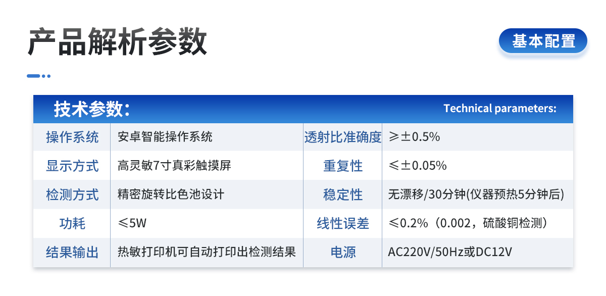 | 1.電源:交流 220±22V 直流 12V+5V(儀器內(nèi)置鋰電池也可用車載電源) | 2.功率: ≤5W | 3.量程及分辨率:0.001-9999 | 4.重復(fù)性誤差: ≤0.02%(0.0002,重鉻酸鉀溶液) | 5.儀器穩(wěn)定性:一個小時內(nèi)顯示數(shù)字無漂移(透光度測量);兩個小時內(nèi)數(shù)字漂移不超過0.3%(0.003,透光度測量)、0.001(吸光度測量)。 | 6.線性誤差: ≤0.1%(0.001,硫酸銅檢測) | 7.靈敏度:紅光≥4.5 ×10-5 藍(lán)光≥3.17×10-3 綠光≥2.35×10-3 橙光≥2.13×10-3 | 8.波長范圍 :紅光:680±2nm; 藍(lán)光:420±2nm; 綠光:510±2nm;橙光:590±4nm | 9.顯示屏分辨率:1024*600 | 10.抗震等級:IP65 | 11、儀器尺寸:48×34.5×22cm | 12、主機(jī)凈重:5.2kg |