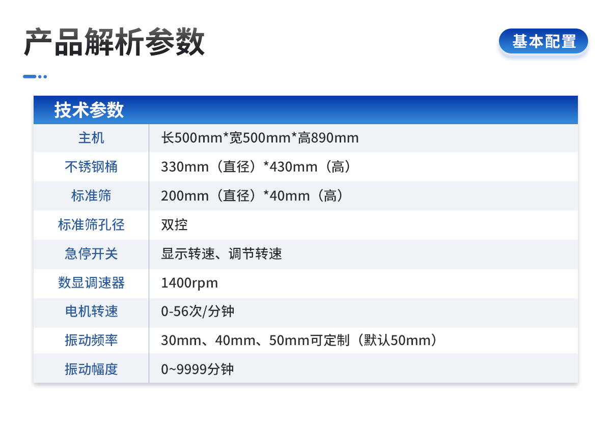| 1、主機(jī):長(zhǎng)500mm*寬500mm*高890mm | 2、不銹鋼桶:330mm(直徑)*430mm(高) | 3、標(biāo)準(zhǔn)篩:200mm(直徑)*40mm(高) | 4、標(biāo)準(zhǔn)篩孔徑:10mm,7mm,5mm,3mm,2mm,1mm,0.5mm,0.25mm。(可選配其他規(guī)格孔徑) | 5、急停開(kāi)關(guān):雙控 | 6、數(shù)顯調(diào)速器:顯示轉(zhuǎn)速、調(diào)節(jié)轉(zhuǎn)速 | 7、電機(jī)轉(zhuǎn)速:1400 rpm | 8、振動(dòng)頻率:0-56次/分鐘 | 9、振動(dòng)幅度:30mm、40mm、50mm可定制(默認(rèn)50mm) | 10、計(jì)時(shí):數(shù)顯計(jì)時(shí)器 | 11、定時(shí)范圍:0~9999分鐘 | 12、電源:220V 50Hz 120W | 13、漏電保護(hù)器:10A |