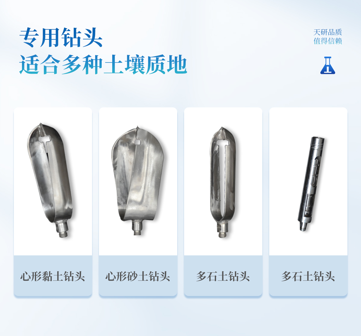 | 可針對(duì)不同直徑的土壤顆粒配備不同的專(zhuān)用鉆頭,對(duì)不同深度和區(qū)域的土壤進(jìn)行合理采樣和分類(lèi)。 |