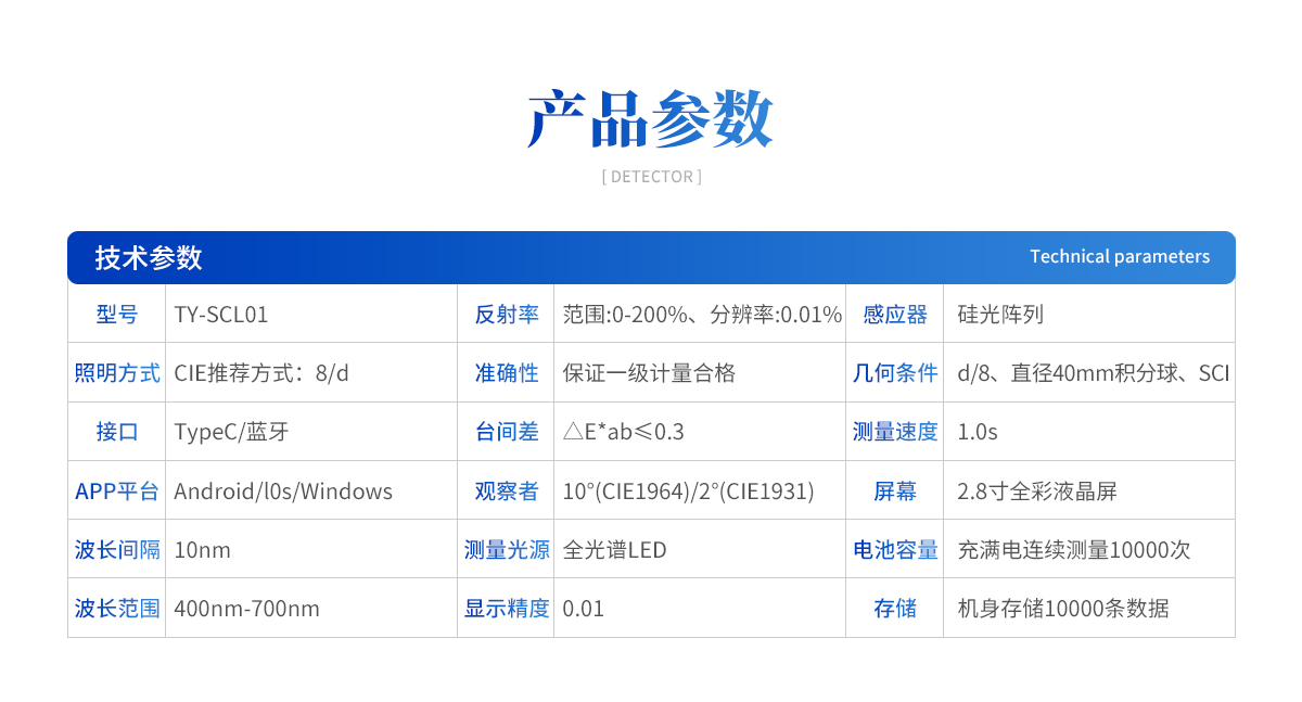 TY-SCL01色差儀全新升級(jí)款!采用Type C充電接口,內(nèi)置鋰電池充電,測(cè)量按鍵長(zhǎng)按開機(jī)測(cè)量,采用黑白手動(dòng)校準(zhǔn)技術(shù),保證每一次測(cè)量的顏色數(shù)據(jù)一致性穩(wěn)過計(jì)量。功能亮點(diǎn):①高精度分光結(jié)構(gòu),測(cè)量數(shù)據(jù)**穩(wěn)定d/8測(cè)量結(jié)構(gòu)、SCI模式,D65光源,支持多種測(cè)量方式保證**測(cè)量條件。重復(fù)精度ΔE*ab≤0.03,臺(tái)間差ΔE*ab≤0.3,數(shù)據(jù)