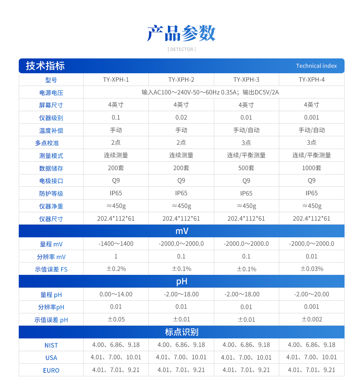 | 1.支持IP65防護(hù)等級。 | 2.支持自動識別NIST、USA、EURO*多三點標(biāo)定功能。 | 3.支持背光和恢復(fù)出廠、手動溫補(bǔ)、連續(xù)測量模式功能。 | 4.顯示標(biāo)定、測量和數(shù)據(jù)穩(wěn)定符號及溫度、電極斜率數(shù)據(jù)。 | 5.支持?jǐn)?shù)據(jù)儲存、查閱、刪除功能。 |
