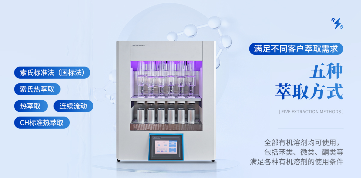 產(chǎn)品介紹:全自動脂肪測定儀(索氏提取儀)是根據(jù)索氏抽提原理,對脂肪等有機物進行萃取分離的儀器。儀器具有索氏標準法(國標法)、索氏熱萃取、熱萃取、連續(xù)流動及CH標準熱萃取等五種萃取方式;采用整體嵌入式金屬加熱,升溫快, 效果好,功耗低。安卓風格界面設(shè)計,豎屏外置壁掛式控制器,使操作更加簡便快捷;進出水路全方