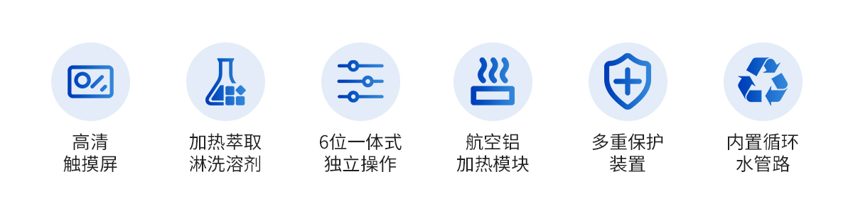 | 1.7英寸大液晶觸摸屏顯示控制,可升級(jí)程序控溫和遠(yuǎn)程操作系統(tǒng) | 2.6位一體式金屬浴加熱系統(tǒng),保證每只樣品可獨(dú)立操作 | 3.航空鋁加熱模塊,升溫速度快,回流速度快,大大縮短提取時(shí)間 | 4.進(jìn)口溫度傳感器,控溫精度高,均勻性好 | 5.自帶加熱萃取、淋洗溶劑回收功能,大大節(jié)約實(shí)驗(yàn)耗材 | 6.內(nèi)置循環(huán)水管路,操作簡單方便(可升級(jí)為內(nèi)置冷卻裝置) | 7.具有過壓,過熱,漏電多重保護(hù)裝置,無需看管,保證機(jī)器長時(shí)間使用的安全性 | 8.可升級(jí)成內(nèi)置冷水系統(tǒng),無需外接水源。具有計(jì)時(shí)和時(shí)間控制的循環(huán)系統(tǒng);冷卻水全自動(dòng)控制。 |