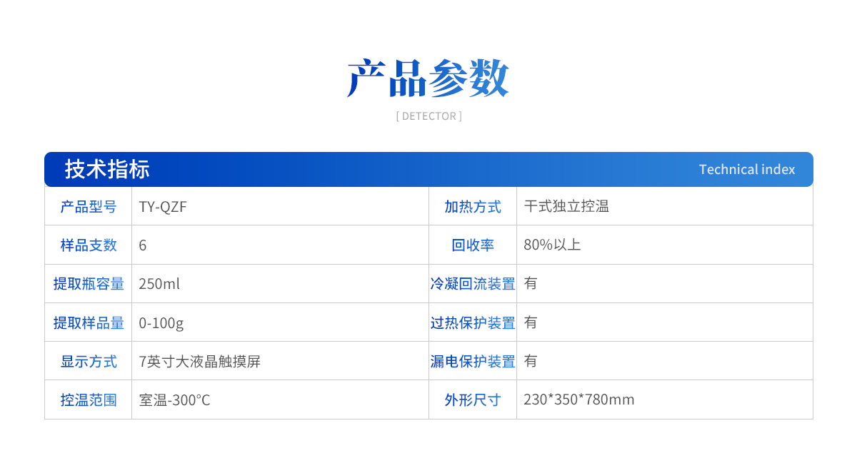 | 產(chǎn)品型號(hào):TY-QZF 樣品支數(shù):6 提取瓶容量:250ml 提取樣品量:0-100g 顯示方式:7英寸大液晶觸摸屏 控溫范圍:室溫-300°C 加熱方式:干式獨(dú)立控溫 回收率:80%以上 冷凝回流裝置:有 過熱保護(hù)裝置:有 漏電保護(hù)裝置:有 外形尺寸mm:230*350*780 |