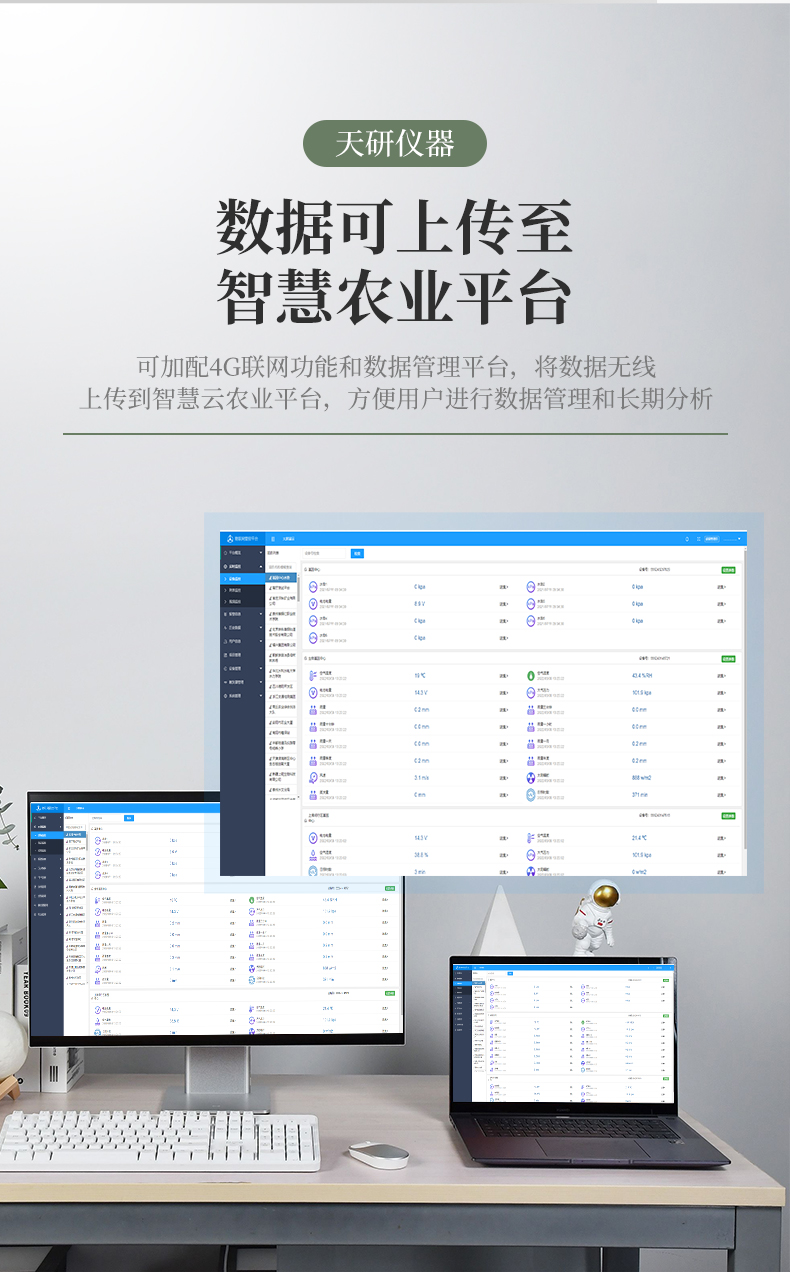 | 儀器可加配4G聯(lián)網(wǎng)功和能數(shù)據(jù)管理平臺(tái),將本機(jī)存儲(chǔ)的被測(cè)點(diǎn)環(huán)境因子測(cè)量歷史數(shù)據(jù)無線上傳到智慧云農(nóng)業(yè)平臺(tái),方便用戶進(jìn)行數(shù)據(jù)管理和長期分析。 | 本機(jī)體積小巧、美觀,操作簡單方便,性能可靠,野外攜帶極為方便。主機(jī)連接傳感器后可以手動(dòng)存儲(chǔ)記錄也可通過主機(jī)任意設(shè)置采樣間隔,自動(dòng)存儲(chǔ)記錄數(shù)據(jù)。 | 大屏幕彩色液晶顯示屏,全程跟蹤記錄各個(gè)被測(cè)環(huán)境因子的數(shù)值、組數(shù)、低電壓示警,主機(jī)內(nèi)置大容量存儲(chǔ)器,可儲(chǔ)存三十萬條數(shù)據(jù),具有斷電數(shù)據(jù)自動(dòng)存儲(chǔ)保護(hù)功能。 | 各個(gè)傳感器插入主機(jī)后,主機(jī)具有自動(dòng)識(shí)別功能,傳感器一致性好,可按需求自行組合傳感器,不同參數(shù)的傳感器接口可以互相轉(zhuǎn)換,對(duì)測(cè)量精度沒有影響。 | 儀器具有多通道自動(dòng)檢測(cè)擴(kuò)展功能,可以實(shí)現(xiàn)多個(gè)傳感器同時(shí)接入的同步檢測(cè)。 | 上位機(jī)軟件功能強(qiáng)大,隨時(shí)可以通過USB接口將記錄中的數(shù)據(jù)導(dǎo)出到計(jì)算機(jī)上,并可以存儲(chǔ)為EXCE表格文件,生成數(shù)據(jù)曲線,以供其它分析軟件進(jìn)一步進(jìn)行數(shù)據(jù)處理。具有設(shè)置超限區(qū)域著色功能,超限數(shù)據(jù)變色預(yù)警,可作為環(huán)境評(píng)價(jià)的一個(gè)依據(jù)。 |