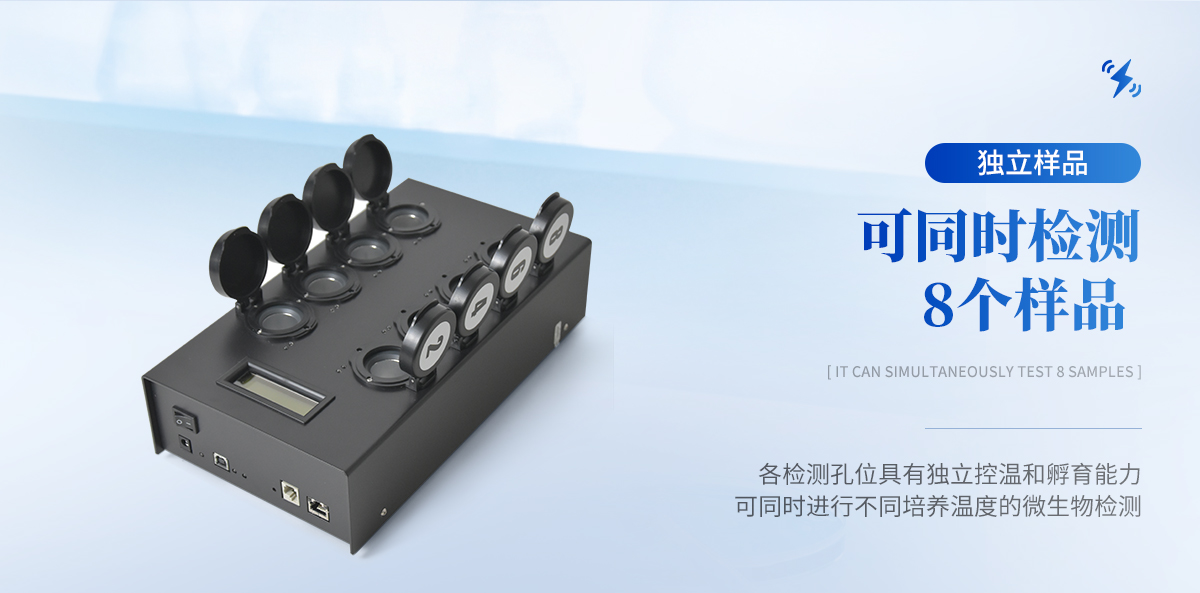 | 1) 可檢測固態(tài)、液態(tài)、表面、膏狀、漿狀樣本 | 2) 樣本在檢測時無需任何的前處理過程,直接丟入檢測瓶即可 | 3) 可自動控制孵育溫度和孵育時間 | 4) 檢測樣本只需1ml/1g;同一溫度下可同時檢測8個樣品 | 5) 靈敏度高達(dá)可檢測到1目標(biāo)微生物;特異性高達(dá)99.999% | 6) 獨立、持續(xù)的檢測并記錄瓶中的微生物數(shù)量(CFU) | 7) 簡單三個操作步驟,傻瓜型,無需專業(yè)操作人員 | 8) 儀器便攜式,可隨時隨地進(jìn)行檢測、100%定量分析,并可直接連接電腦出定量分析檢測報告 |