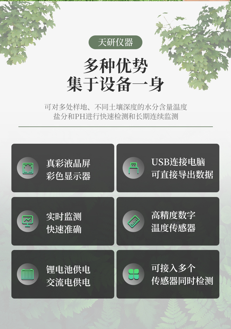 土壤水分溫度鹽分測定儀傳感器采用一體化結(jié)構(gòu)設(shè)計(jì),可快速準(zhǔn)確測量土壤中含水量、溫度和電導(dǎo)率(鹽分),可對多處樣地、不同土壤深度的水分含量溫度和鹽分進(jìn)行快速檢測和長期連續(xù)監(jiān)測。廣泛應(yīng)用于土壤墑情檢測、旱作節(jié)水灌溉、精細(xì)農(nóng)業(yè)、林業(yè)、地質(zhì)勘探、植物培育、水利、環(huán)保等領(lǐng)域。
